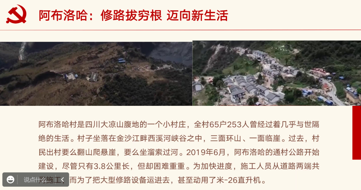迟晓悦同志以脱贫工作中的修路工作为线索,结合毛相林同志的事迹与阿布洛哈村的故事进行了分享。修路在脱贫攻坚中有着重要作用,对于改善贫困地区人民的生产生活有着重要意义。