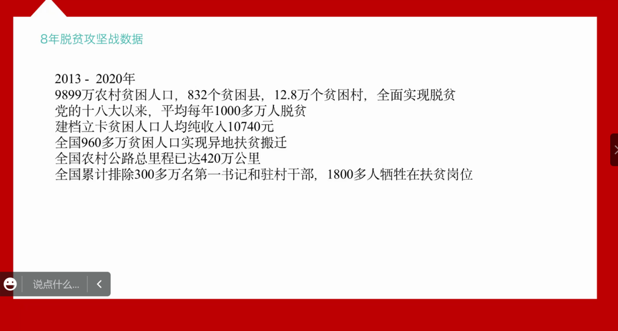 为了增强理论学习效果、提高理论学习参与度、创新理论学习形式,研究生第五党支部开展了微党课系列活动。活动第六期于2022年8月28日20:00在线上腾讯会议室召开,会议由党支部书记赵恒同志主持。本次微党课的主题是“脱贫攻坚”。支部内20名党员与积极分子同志参与了本次微党课的学习。 首先,奏唱国际歌。