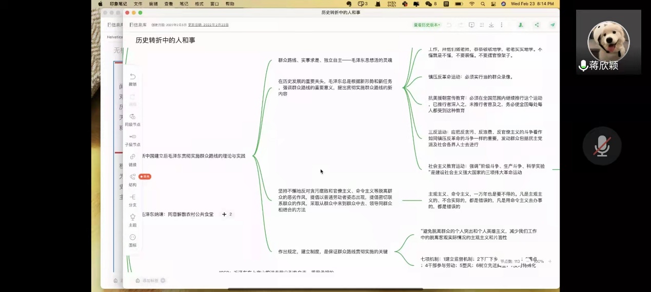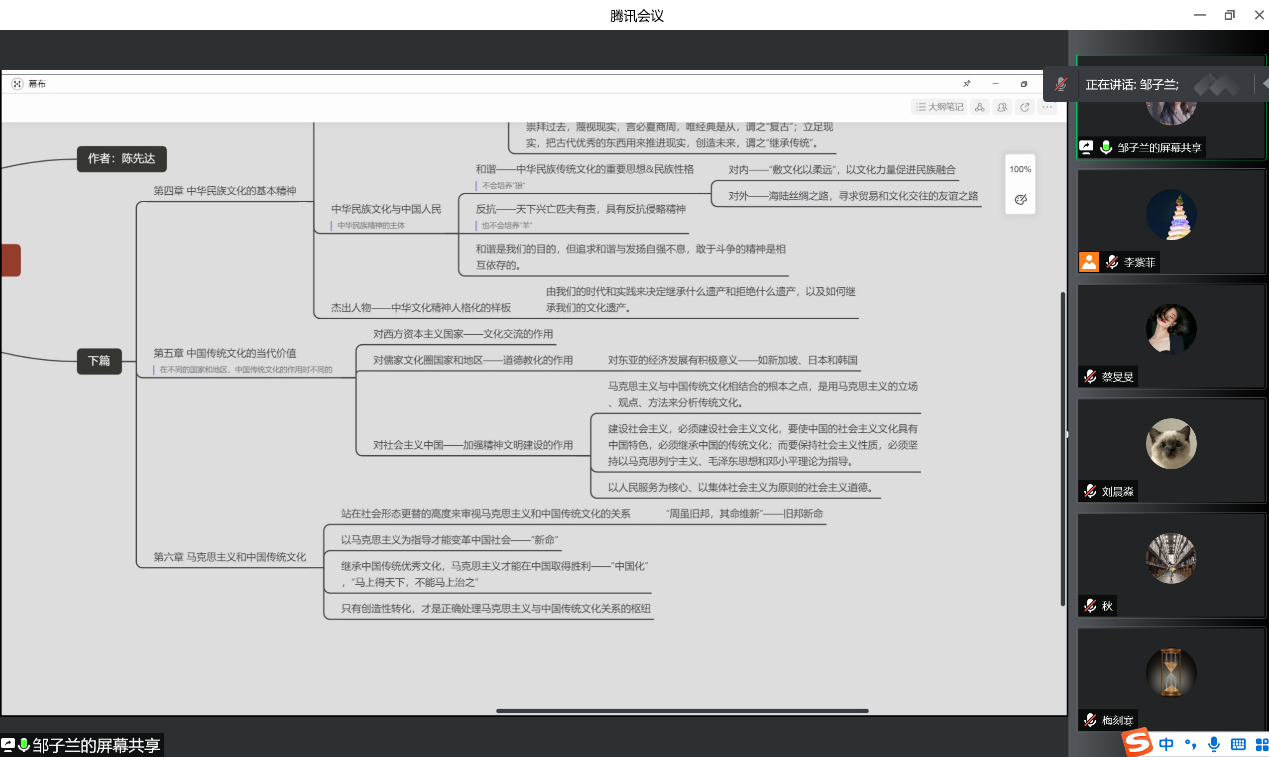 邹子兰同志使用思维导图的方式从坚定马克思主义信仰、马克思主义的当代价值、坚持马克思主义的指导地位、中华民族文化的基本精神、中国传统文化的当代价值、马克思主义和中国传统文化几个方面,对书中关于马克思主义理想、信念、信仰等存在的疑问,马克思主义与中国传统文化的关系问题进行了分享。