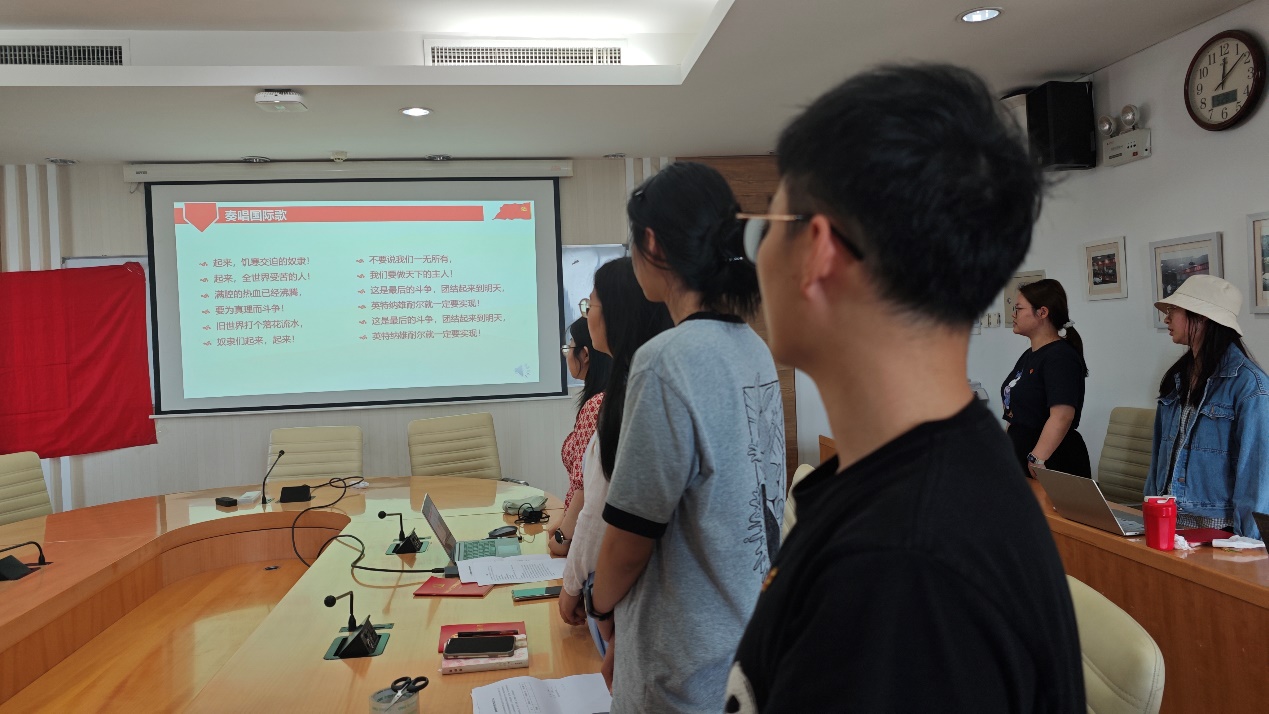 首先, 党支部全体成员起立,合唱《国际歌》。