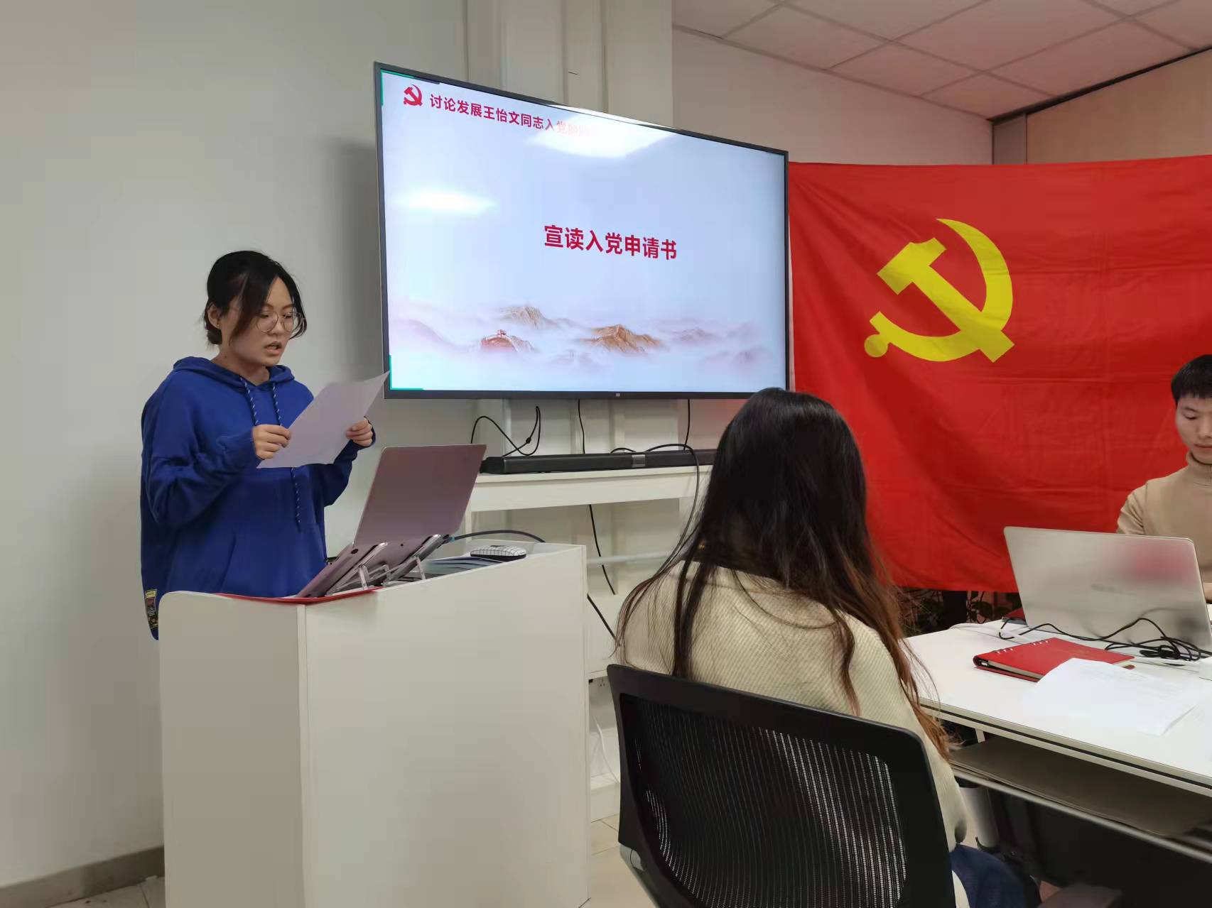 研究生第三党支部召开了党员发展大会。会议由党支部书记丁一主持,党支部所有成员均参加了本次会议。 大会伊始,全体起立奏唱国歌。四名发展对象逐一宣读了入党申请书,详细的汇报了发展期间每个人的思想、学习、工作、生活等方面的情况,总结了自己培养考察期的成长与进步,每位同志都坚定地表达了自己跟党走,为党、为人民贡献力量的决心,以及对于成为中共预备党员的殷切期盼及为党组织为人民奉献终身的意愿。