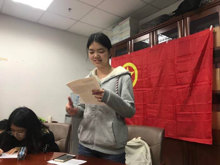 2018年4月21日晚,17级本科第一团支部在后主楼1421会议室召开了入党推优大会。本次申请入党的有四位同学,她们分别是杨格晴、李伊凡、赵一帆和高文进同学。