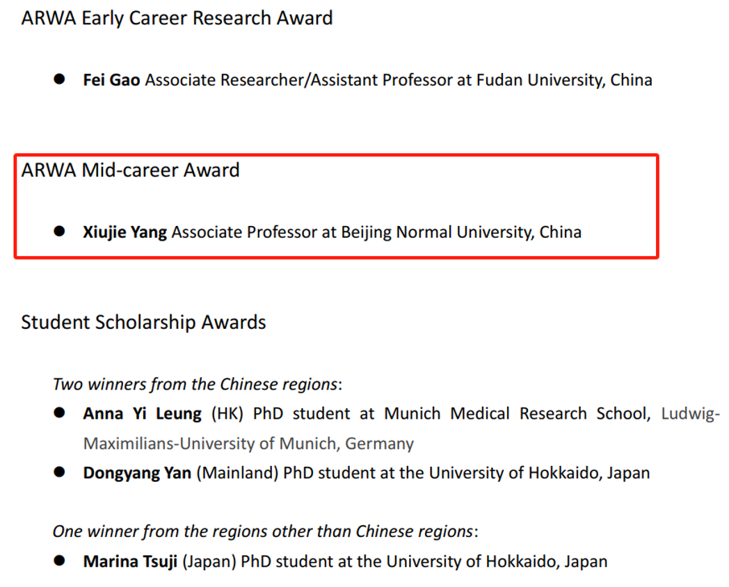 亚洲读写协会(AWRA)主要聚焦于全世界读写能力研究者,并以亚洲语言为主的儿童与成年人的读写能力发展(如中文、日语、韩文等)、读写障碍与语言加工过程,致力于促进关于读写能力的科学研究。Mid-Career Award奖项主要颁发给处于职业生涯中期,并且在语言(阅读)或写作习得领域拥有杰出贡献的研究人员,该奖项每年仅一位获奖人。
