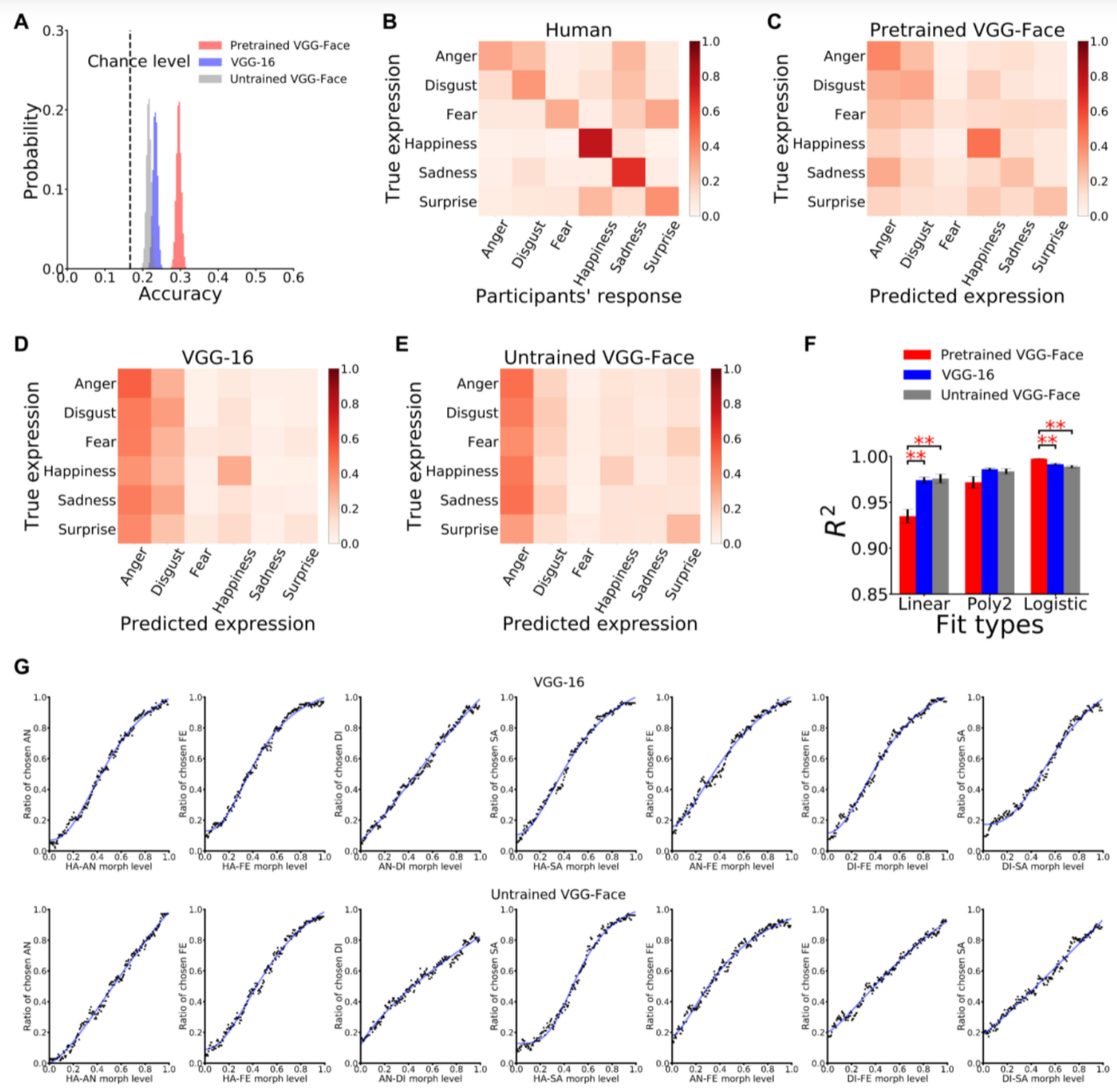 图2 pretrained VGG-Face中自涌现的“表情神经元”的表情混淆效应和类别知觉效应 进一步,为了考查面孔身份相关的视觉经验,是否是VGG-Face自涌现出“表情神经元”所必需的,研究者引入了另外两个深度卷积神经网络模型,预训练好的VGG-16(pre-trained VGG-16)和没有经过训练的VGG-Face(untrained VGG-Face),来进行比较。这两个网络的基本架构与VGG-Face相同,但pretrained VGG-16是通过大量的自然图片被训练用于物体分类任务,untrained VGG-Face则没有任何训练经验。研究者们发现,虽然pre-trained VGG-16和untrained VGG-Face也能涌现出 “表情神经元”,具有情绪选择特异性(图3A),但这些“神经元”不能表现出稳定的与人类似的表情混淆效应和类别知觉效应(图3D-G)。这个结果表明,面孔身份信息相关的视觉经验在面部表情知觉能力的发展中具有重要作用,强调了后天环境因素在形成类人面部表情知觉方面的必需性。