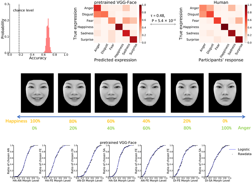 该研究首先从已经训练好的用于面孔身份信息识别的深度卷积神经网络(pretrained VGG-Face,图1)中筛选出对六种基本表情(愤怒、厌恶、恐惧、快乐、悲伤和惊讶)具有选择特异性的“表情神经元”。研究者们使用在人类被试上所建立的经典实验范式来打开深度卷积神经网络的黑箱,揭示这些“表情神经元”如何表征面孔情绪信息。他们发现,这些“表情神经元”具有与人类似的情绪知觉表征特性,呈现出相似的表情混淆现象和类别知觉效应(图2)。