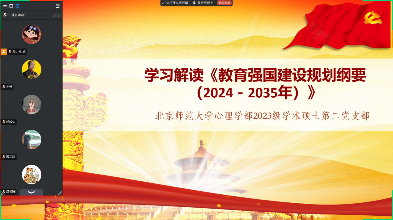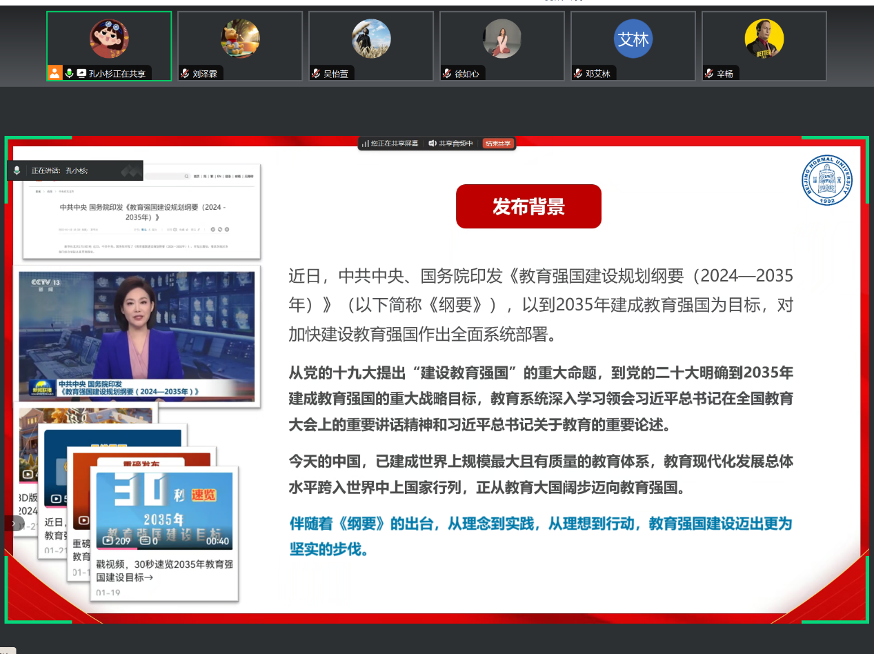 为深入贯彻落实党中央关于教育强国建设的战略部署,2025年1月31日晚9点,欧洲杯 2023级学术硕士第二党支部通过线上腾讯会议召开专题党课,组织支部成员共同学习《教育强国建设规划纲要(2024-2035年)》(以下简称《纲要》)。本次专题党课由党支部书记孔小杉同志主持,共15名党员和6名积极分子参与。