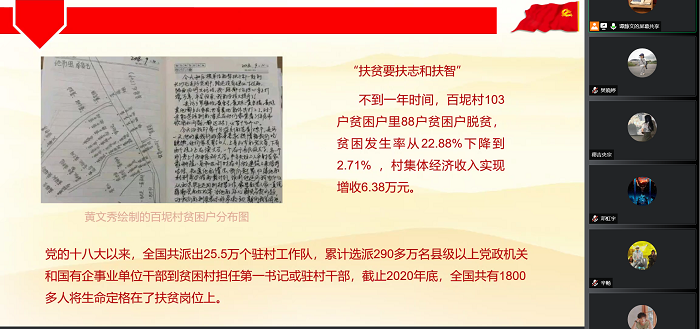 接着,谭静文同志组织大家观看了《北京师范大学师生印象中的黄文秀》,黄文秀在师生的眼中是一个对待工作认真负责且有热情的女孩。党的十八大以来,全国的脱贫攻坚工作全面推进,截止2020年,全国共有1800多人将生命定格在了扶贫岗位上,黄文秀便是其中一人,让人感触颇多。