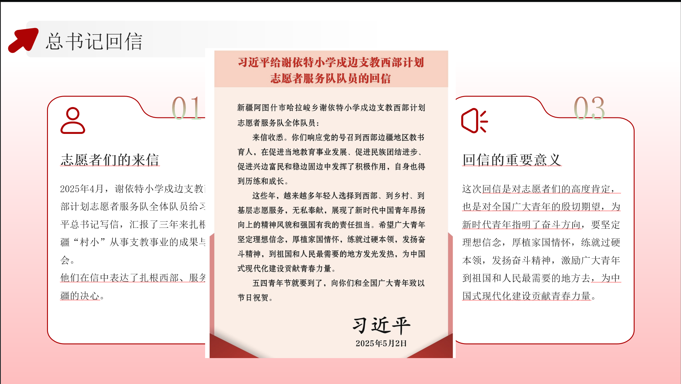 习近平总书记五四前夕的回信成为全场焦点。信中高度肯定志愿者们“促进教育发展、推动民族团结”的贡献,勉励全国青年“到祖国最需要的地方去”,为新时代青年锚定了奋斗坐标。结合回信精神,活动提出三点实践倡议:一是深入学习党的创新理论,将个人理想融入民族复兴伟业;二是厚植家国情怀,传承中华文化、投身国家建设;三是练就过硬本领,通过专业学习与社会实践增强竞争力。
