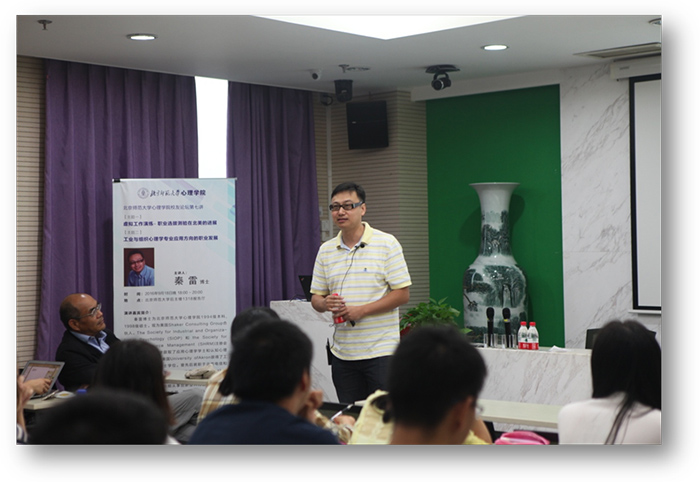 北师大心理学院“心天下-校友分享论坛”是北师大心理学院MAP教育中心主办的特色活动,每个月一期,邀请优秀校友回到心理学院与在校生进行主题分享。在校友们的大力支持之下,心天下-校友分享论坛继2015年首届召开以来已经累计召开完成了七场。9月18日,心天下-北师大心理学院校友论坛第七讲在心理学院1318会议室顺利进行。本次校友论坛邀请到的主讲嘉宾是在美国工业与组织心理学应用领域有着多年研究经验的秦雷博士。秦雷博士是北京师范大学心理学院1994级本科、1998级硕士校友,美国University of Akron工业和组织心理学博士。现为美国Shaker Consulting Group合伙人,SIOP和SHRM注册会员。目前,秦雷博士在Shaker Consulting Group负责管理客户支持、测验研究及数据分析团队的工作,长期从事创新型人力选拔测验和仿真工作模拟系统的开发和应用,在虚拟工作演练和工业与组织心理学专业应用有着丰富的理论和实践经验。