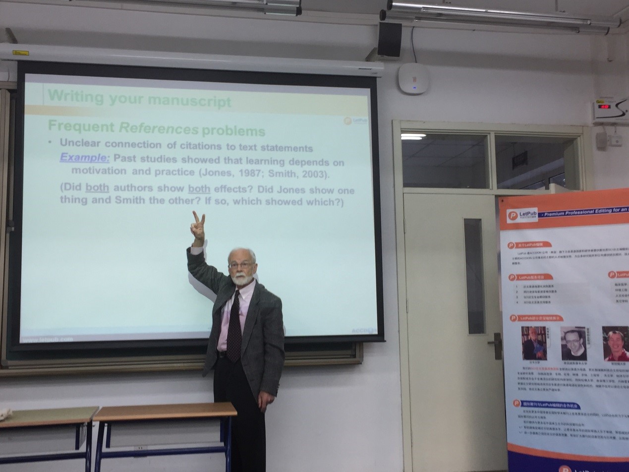 2015年12月16日下午,LetPub在我校教四楼101阶梯教室举办了“治学修身”系列之国际学术论文发表的相关讲座。会议成功邀请到曾担任《Metaphor and Symbol》、《Teaching of Psychology》等杂志编委会成员的美国北卡大学终身教授Cabe,分别从研究者、审稿人、编辑的角度就成功发表SCI论文的策略,撰写SCI论文的实用技巧等给予详细阐述,并在会后同与会人员进行了提问式交流。 图1 Cabe教授讲授英文论文写作的技巧 此次会议吸引了100多位来自北京各个高校不同学科领域的科研学者参加,会场气氛活跃,Cabe教授同与会人员进行了良好的互动。会后工作人员积极向参会老师讲解LetPub服务流程及涉及的学科领域,并根据不同需求详细介绍服务内容。 图2 同学们认真聆听讲座 通过此次讲座,与会者从资深SCI期刊编委身上学习到了如何进行撰写满足国际期刊要求的英文文章、怎样回复审稿人的问题等非常有用的技巧,也深入了解了美国LetPub编辑可以为中国科研学者和国内英文期刊提供的编辑服务内容。