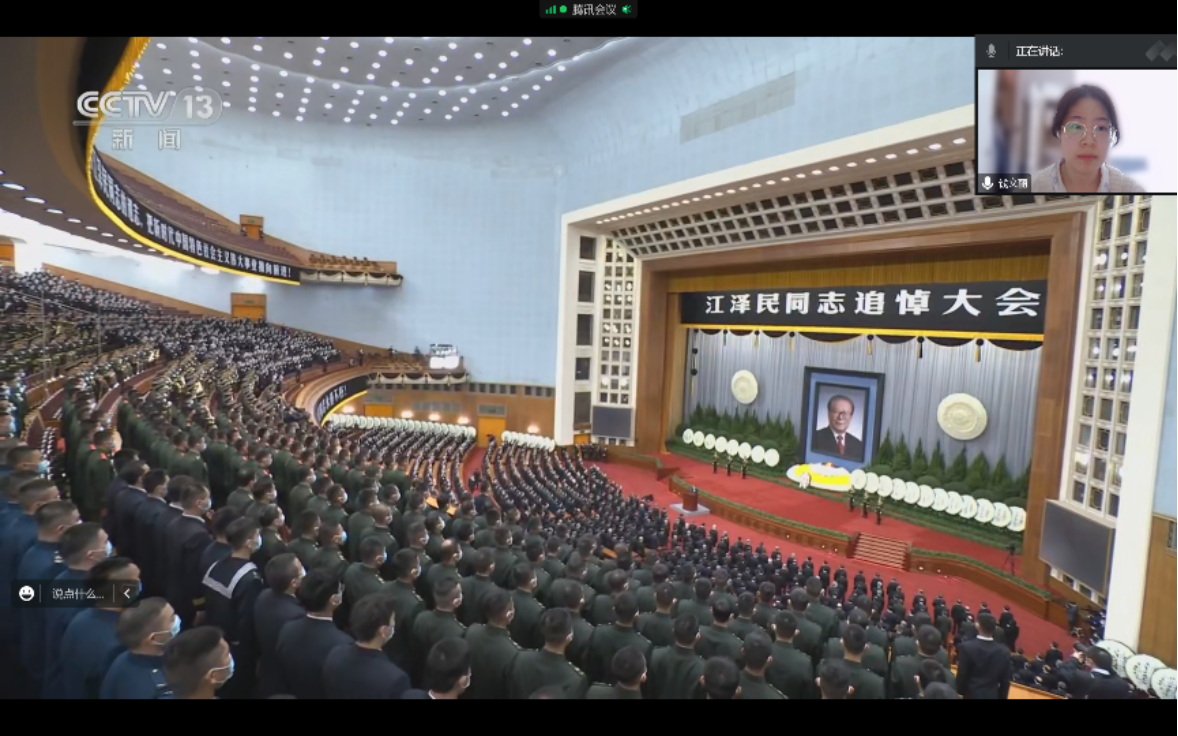 2022年12月6日上午,欧洲杯 研究生第七党支部同志怀着无比沉痛的心情,通过视频网站收听收看江泽民同志追悼大会,聆听习近平同志致悼词,深切悼念江泽民同志,缅怀其光辉伟大的一生。