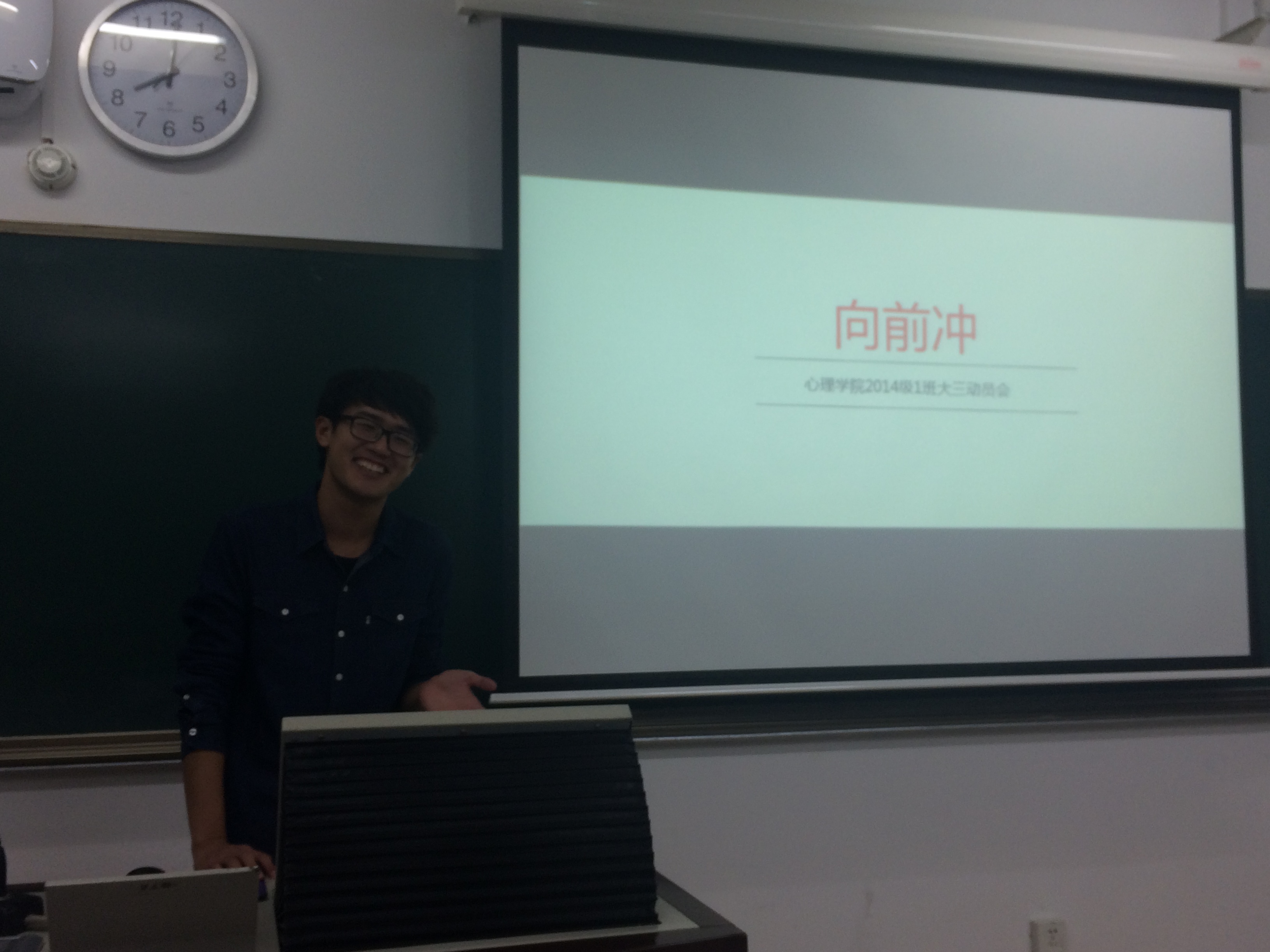 2016年10月14日晚,班长在教二107召开了大三动员大会。动员会由班长做动员讲话,参与动员会的为心理学院2014级1班同学。 本次活动主要有两个出发点。首先,大三是本科生涯中的重要转折点,为帮助同学们更好地走入大三,有必要给同学们提供一定的指导。其次,大三之后几乎没有了全班一起上的大课,同学们之间的联系可能会愈加淡薄,因此有必要在大三之初给予同学们一个相聚的机会。 本次动员大会主要包括两部分。一是班长的发言讲话与同学们的讨论,二是同学们的互动游戏环节。首先,班长对大二这一年的同学们的学习和活动进行总结,然后根据大二这一年同学们的综合测评分析了大三的方向问题,提醒同学们步入大三应当及时地思考未来的生涯规划,是选择继续深造还是毕业就业。之后,同学们分组讨论了自己的想法。紧接着,本着“学习与娱乐”相结合的交流思想和活动宗旨,在班委的组织下,同学们进行游戏互动,烧脑的小游戏获得了同学们的喜爱,让动员会在欢乐的氛围中圆满结束。 本次动员会持续了两个小时,提醒了同学们作为大三的学生应当思考的问题,为接下来的学习生活制定了目标和规划;也为同学们的互动交流提供了平台,增强了心理学院2014级1班的集体凝聚力。