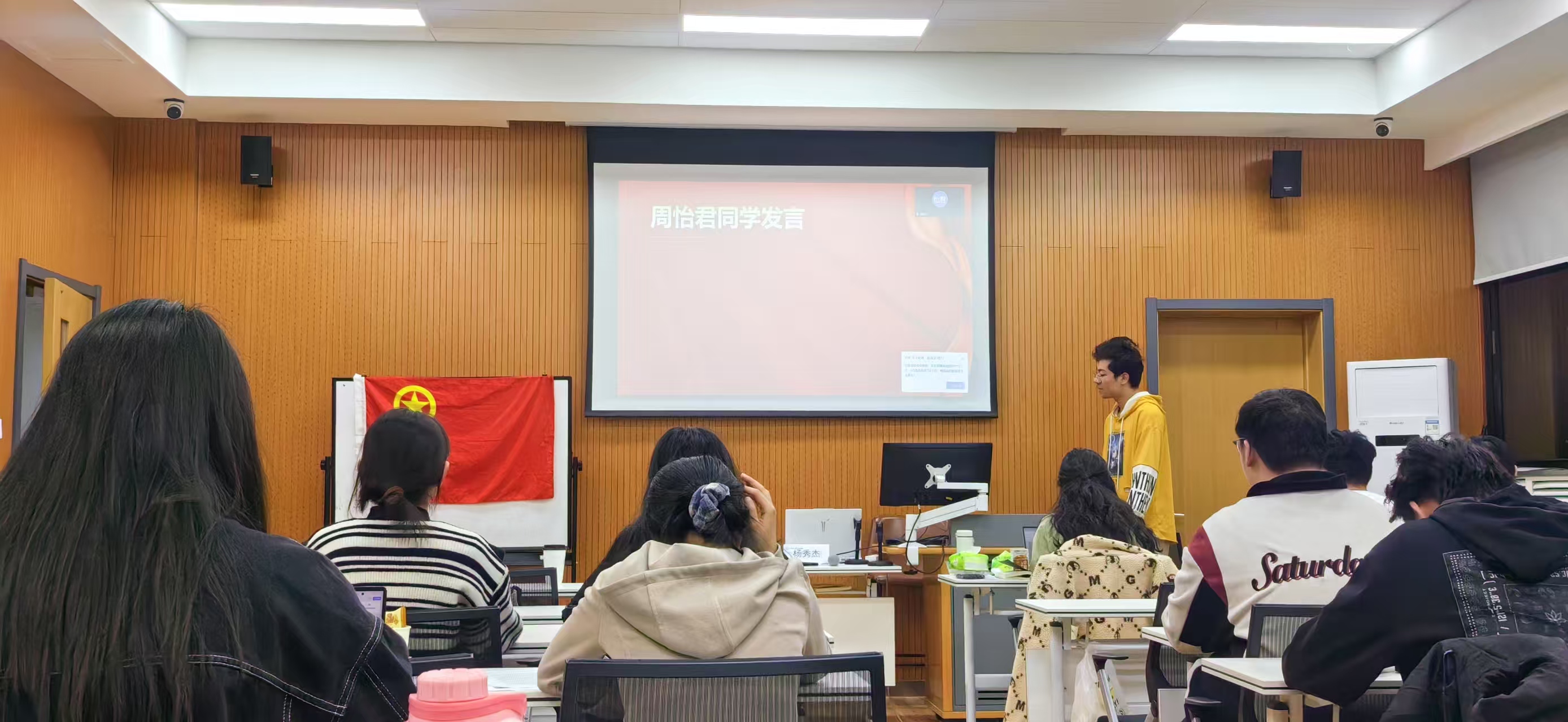 随后,团支书龙柄屹在屏幕上清晰呈现《推优工作实施细则》。从思想汇报的"五个维度"到民主评议的"三维坐标",严谨的逻辑框架中透着人文关怀。特别强调的"过程留痕"要求,让在场的每位同学都深刻认识到:组织上入党一生一次,思想上入党一生一世。 最动人的时刻属于三位推优申请人。邹盛桐、徐琬颖和周怡君同学以拳拳赤子之心诉说对党的热爱与敬仰,三名同学怀揣着对中国共产党的无限向往,在学习和生活中不断向党中央靠拢看齐,令人为之动容。
