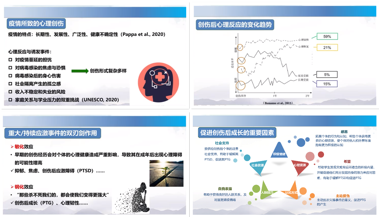 该课程主要围绕疫情对学生心理健康的消极影响和积极转化两个方面展开,介绍了疫情防控政策转变背景下学生心理健康教育面临的新形势、新特点与推进策略。