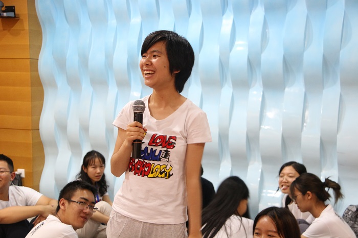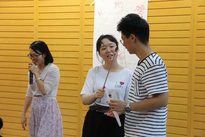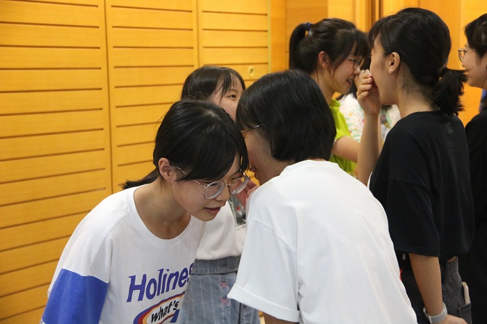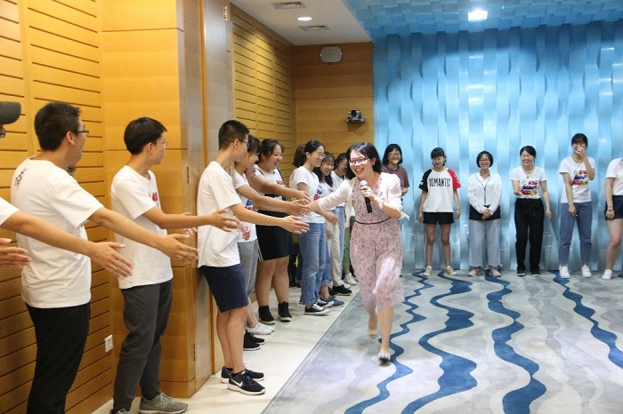 令大家受益匪浅的是,黄利老师引导大家以全新的角度看待失误——失误也是一次成长的好机会,你也可以“变废为宝”。所以出现错误之后的“惩罚”开启了大家看待挫败,接纳自己不完美的新旅程,也是认识更多朋友的新机会。 第二个活动为幸福大转盘——组内结识say hello。大家按照1和2报数分为内、外两圈形成搭档。搭档们要在老师下达口令“我和你say hello”之后,选择自己感觉舒服和安全的方式打招呼:用手指表示出1/2/3/4,不同数字代表不同的打招呼方式(从1-4分别代表微笑、握手、拥抱和抱起来转一圈四个级别的打招呼方式),取数字低的一方完成。在打招呼之后同学们相互进行简单的自我介绍。
