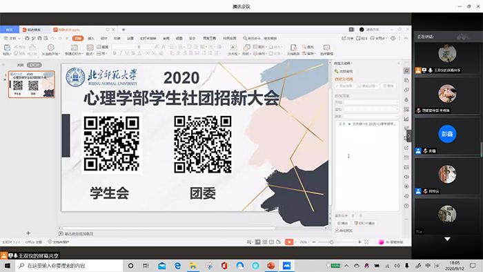 2020年9月12日18:00,欧洲杯 2020年秋季学生团体线上招新活动于腾讯会议上成功举办。本次活动以欧洲杯 各学生团体招新为主要内容,由欧洲杯 团委组织开展,王双仪同学主持。欧洲杯 团委、学生会、心理健康者协会、各球队、辩论队、性格学社,椰丝团等学生团体共计34位部门代表参加招新活动。