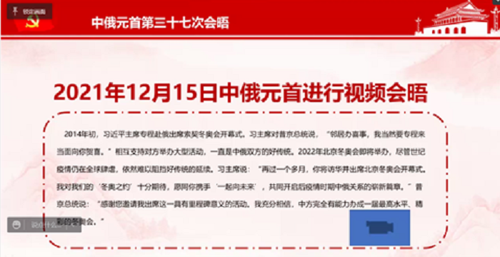 李铭同志分享的时事是中俄元首的第三十八次会晤,通过观看两则有关习近平主席与普京总统的视频,他分析中俄元首会晤的含义,即友谊、合作,面对国际关系,共同维护国际公平正义。