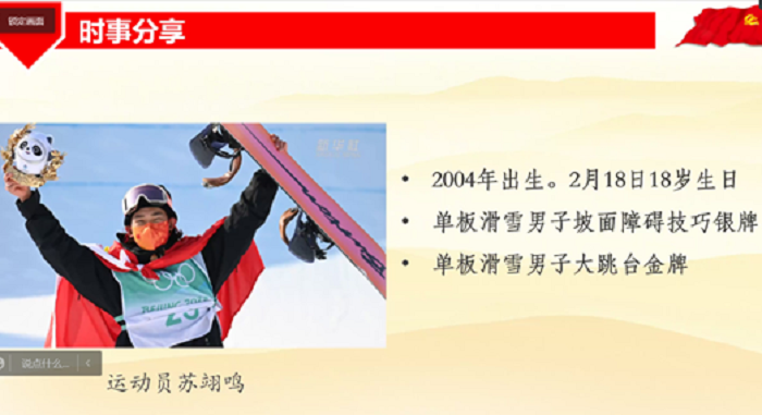 第三位分享的同志是王恺芃,主要介绍了中国运动员苏翊鸣的事迹,说明了从他身上学到了勇于挑战自己,追求“第一”的精神,并提出了两个问题:如何看待多项事业齐头并进?在失败成本高的情况下,中国职业运动员的生涯是怎样的?