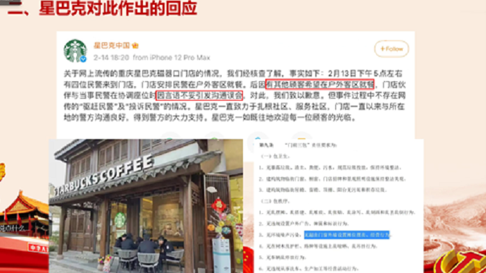 颜露懿同志分享了星巴克驱逐民警的事件。她讲述了事件经过、星巴克对此做出的回应,并进行了总结和讨论。