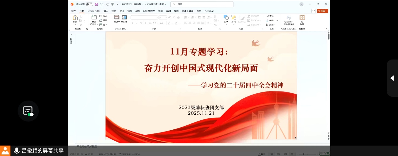 2025年11月21日晚6点,2023级励耘班团支部组织通过线上会议召开了“奋力开创中国式现代化新局面——学习党的二十届四中全会精神”专题学习,团支书吕俊颖同学主持了本次会议。 会议伊始,全体团员共同学习了《中国共产党第二十届中央委员会第四次全体会议公报》。会议重点聚焦“十五五”时期(2026-2030年)在我国社会主义现代化进程中的关键地位,明确了这一时期是为未来宏伟蓝图夯实基础、全面发力的攻坚阶段。