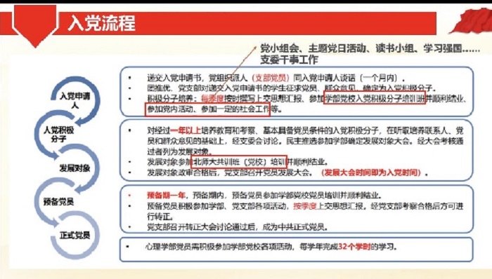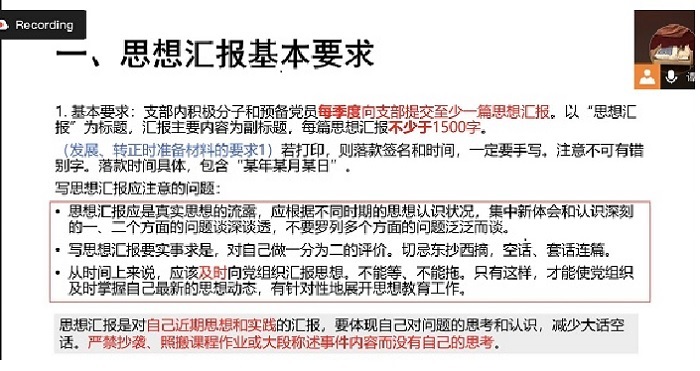 随后,谭静文同志带领与会人员重温了入党流程,并对积极分子即将完成的思想汇报、参与的成长营以及支部内活动等任务要求进行逐一介绍。首先谭静文同志借助示例讲解了思想汇报的写作要求和提交要求,强调思想汇报的重要性,以及绝不能抄袭的要求。其次了介绍支部内活动的类型,如党小组会、主题党日活动、读书小组和学习强国平台使用等。