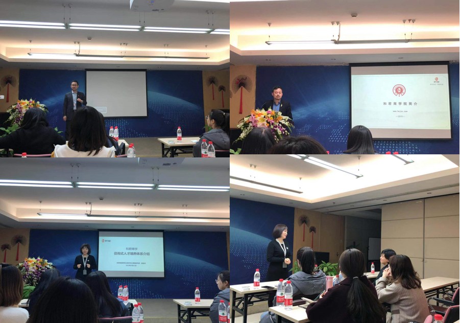 走进和君咨询5000平米的办公楼,一股浓浓的和君之风扑面而来。在金牌讲解员的引导下,同学们认真地聆听、细致地观察,充分地感受到了和君 “人生如莲与三度修炼”、“水的精神”、“卓有识度,圆融会通” 的欧洲杯。 和君的文化和视觉形象或睿智、或优美、或深情地向同学们展示了如何端正态度、升华气度和夯实厚度,最终走向灿烂人生,实现"誓做一个真正受人尊敬的公司"的企业追求。 在接下来的环节中,张卢锋先生为同学们讲述了和君咨询的发展史,通过张老师的讲解,同学们了解到和君是一个从咨询出发、凭咨询立身的咨询机构,经过十余年的发展,逐步走出了一个“一体两翼”(即以咨询“管理咨询+投资银行”为体,以资本和商学教育为两翼)的业务格局。然后,潘番先生为同学们介绍了和君商学院的情况,同学们也了解到了和君商学院主要面向清华、北大、人大、南开等京津地区高校学生以及部分在职人士,致力于培养、储备和输送高级管理和金融人才,并为企业的员工和客户培训提供系统解决方案。最后,袁宝华女士为大家详细地介绍了咨询式人才培养体系,并与同学们就工作职责、人力资源测评师培训、职业规划、实习交流等相关问题跟进行了互动交流。 图2 欧洲杯 2018级MAP-MHR方向学生了解和君咨询欧洲杯和案例学习