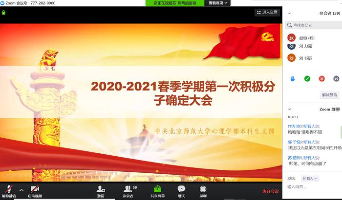 2020年3月29号,本科生党支部召开了春季学期第二次线上组织生活会和2020年春季入党积极分子确定大会。本次生活会结合之前在“学习强国”平台上学习的疫情防控公开课进行研讨。本次组织生活会由支书苏茹昕组织召开。首先同志们起立齐唱国际歌。 之后,在苏茹昕同志的主持下,大家根据自己所学的研讨课内容分成小组,进行20分钟左右的组内讨论。各位同志在组内纷纷分享了自己对于相关课程的学习感受。 之后各组轮流选择代表分享自己小组对于课程内容的观点。 学习了“为疫情防控提供有力法治保障”课程的陶泽霖同志强调了法律保障非常重要。我国已经有了一个相对完善的防治法律体系,例如传染病防治法、突发事件应对法等,这次疫情的防治过程中暴露出的不足也将使法律体系更加完善。作为公民的我们,也应该积极学习法律知识,保护自身的权利。 学习了“新冠肺炎疫情下大学生心理健康的促进方法”课程的赵一帆同志为大家详细讲解了大学生在疫情过程中的消极心理状态和积极心理状态,并讲授了一些心理健康的促进方法。 学习了“事事关心,人人尽力”课程的周楚皓、周婧怡同志向大家介绍了蒙曼教授提出的“忧国、治国、报国”的观点。我们通过调整和改变生活方式、应对方式、表达方式来忧国,我们国家治国也有思想基础、资源基础和制度基础,最后,指出我们作为学生党员应该努力学习以专业报国、保持身体健康以健康报国、满怀爱国情怀以精忠报国。 还有其他学习小组的成员也一一进行了分享。各位同志仔细倾听其他小组的分享,收获很多。 随后,苏茹昕同志主持召开2020年春季入党积极分子确定大会。12位通过团组织推优的优秀团员一一发言,陈述自己的入党动机和对党的认识,并接受了各位党员的提问。 最后各位党员对候选人进行了投票。12位优秀团员被成功确定为入党积极分子。 (本科生党支部 赵恒 供图供稿) |