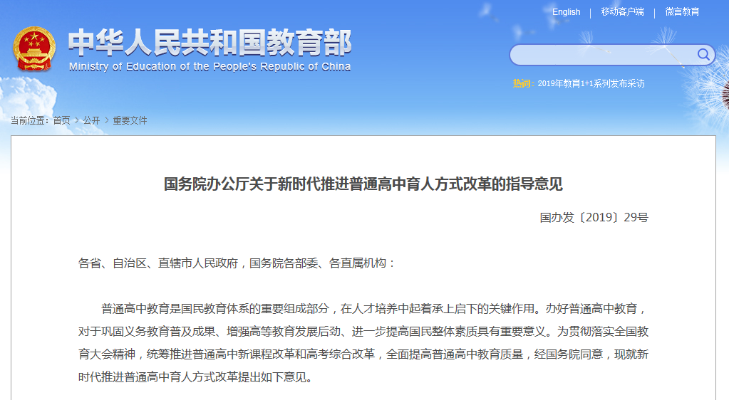 《国务院办公厅关于新时代推进普通高中育人方式改革的指导意见》全文如下: //www.moe.gov.cn/jyb_xxgk/moe_1777/moe_1778/201906/t20190619_386539.html |