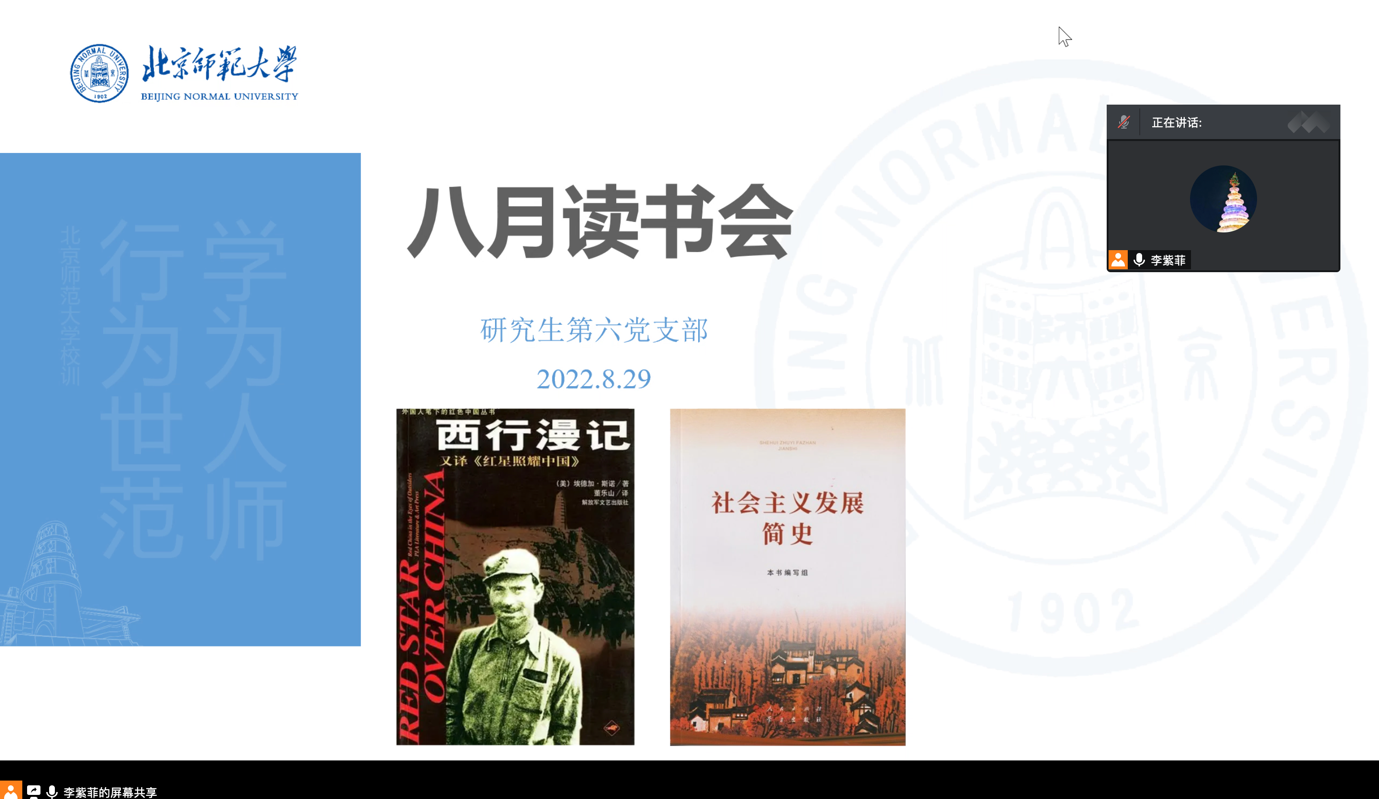 2022年8月29日晚,欧洲杯 研究生第六党支部在腾讯会议举办了第八期红色读书分享会。活动由张涵宇和蔡旻旻两位同志分享《西行漫记》和《社会主义发展简史》两本书的内容及自己的阅读感想。