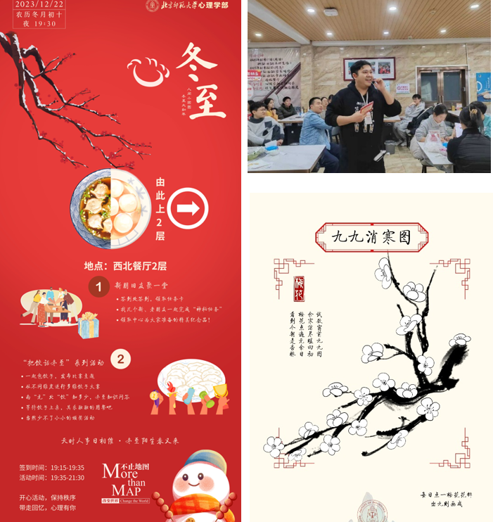 晚上七时许,位于西北餐厅二楼的活动现场已经陆续迎来了前来参与活动的师生,为了欢迎大家的到来,现场的工作人员在签到时为参与者准备了破冰游戏卡和姓名贴,还有精美的纪念品。在破冰环节中,为大家设计了诸如“找一位和自己专业方向不同的伙伴,和它击掌”、“找一位伙伴,在ta的提示下猜猜ta的家乡”等收集签名的互动小任务,集满全部任务签名的同学还可以兑换为本次活动特意制作的纪念品——“九九历”和“消寒图”。