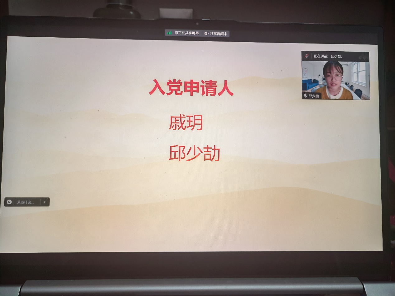 支部书记李紫菲对2位优秀同学介绍完毕,戚玥和邱少劼2位同学依次进行自我介绍并介绍自己的入党动机。 戚玥:作为出生于世纪之交的一代,我在成长过程中真切体会到了在中国共产党的领导下国家的飞速发展,也受到身边共产党员们榜样作用的许多影响。作为一名发展心理学方向的学生,我在学习中了解到了很多教育政策,为国家教育事业所取得的成就而震撼,也在不断反思回忆我自以为的平平无奇的成长道路,是背后多少教育者在党的领导下做出的工作和奉献所保障的。这些使我认识到个体的成长和发展从来都不是与国家和社会孤立脱节的,我们所经历的国家发展、人民生活水平提高,是以中国共产党为国家的领导核心,在几代人艰苦的拼搏、奋斗下取得的成果。因此,我希望能够加入中国共产党,在党组织的领导下,和其他人汇聚在一起,为小到个人和家庭、大到国家和社会的发展贡献一份力量。