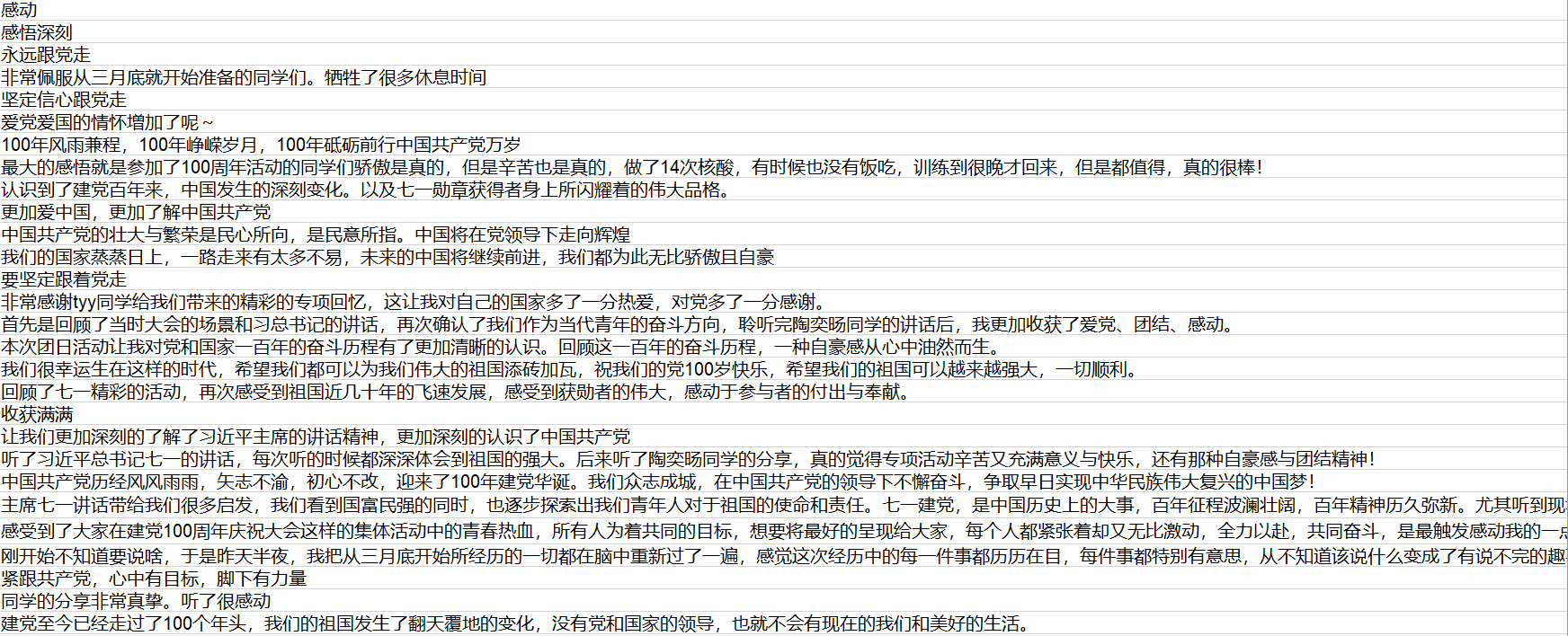 2021年8月1日19:00,欧洲杯 2020级本科第二团支部“建党百年 强国有我”七一主题团日活动在线上顺利召开。会议由团支书段雨欣同学主持。 为庆祝中国共产党建党100周年,进一步增强共青团系统听党话、跟党走的使命意识,坚定党旗所指、团旗所向的政治方向,落实党有号召、团有行动的实践观念,根据上级团组织要求,我支部举行本次团日活动,会议由激情而富有青春活力的团歌开始,接着大家观看了“七一勋章”颁授仪式片段回放,七一勋章作为党内最高荣誉,获得者们就是各条战线上党员中的杰出代表,我支部团员们将以他们为榜样,建功立业,弄潮时代! 随后,大家观看了建党100周年庆祝大会回放节选,青年的表演朝气蓬勃,阳光向上;总书记的讲话声声有力,句句铿锵。天安门广场上不断地欢呼声也引起同学们的共鸣。我们生逢盛世,当不负盛世。 接着,我团支部参与庆祝大会合唱的同学和同学们分享了参与活动的体会和经历, 陶奕旸同学在会上进行分享,回忆了烈日下的次次训练,大家共同克服困难的坚定;回忆了每次训练结束后军乐团,各高校之间挥手致意的温暖,在训练过程中,大家已经形成了某种奇妙的连结,都在为了完成这项重要的使命而努力着。从开始只是很喜欢和大家一起唱歌,到感受到使命感,再到庆祝大会现场唱到“我们献身着壮丽的事业,无限幸福无限荣光”时发自内心的那种喜悦和自豪,有一种认同感,归属感,有一种热泪盈眶的感觉,唱出这些歌曲来为建党百年献礼时,美好的笑容是不需要刻意做出的。 涂康文潇同学以文字稿用三个关键词“温暖”,“严谨和劳累”及“自豪和感动”和同学们分享了感受,涂康文潇同学回忆了烈日下的次次合练,他们都认真对待,因为这代表着国家,代表着国家的青年,更一定要拿出最棒的面貌,为全国人民以及世界展示中国青年的风采!总书记的讲话多次被天安门广场的欢呼声打断。这是人民群众发自内心最真实的喜悦,没有经过排练,没有任何人要求,人民群众自发的,迸发出内心最激动的情感。是人民对祖国动听的情话! 最后,团员们填写问卷分享了自己的感想。大家都为总书记讲话中体现的百年来中华大地翻天覆地的变化而自豪,为参与专项活动的同学们的辛勤付出和真情实感所感动,立志永远跟党走,创造更加美好的生活。 总书记在庆祝大会上寄语青年,号召中国青年要以实现中华民族伟大复兴为己任,增强做中国人的志气、骨气、底气,不负时代,不负韶华,不负党和人民的殷切期望!我支部团员必将以建党100周年为新起点,在全面建成社会主义现代化国家的新征程上贡献青春力量,请党放心,强国有我! |