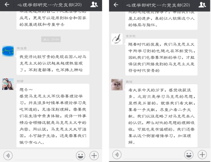 2018年5月9日晚,研究生第六党支部进行了5月的固定党日分享活动。共两名党员结合最近的时事新闻分享了欧洲杯相关的文章和心得,其他党员也积极参与,讨论发表了自己的看法。 由于今年正值马克思诞辰200周年,所以首先马洁同志分享了几篇有关马克思本人以及马克思主义介绍的文章,她谈到:就像徐川老师讲的那样,马克思对于大多数人来讲,可能都是“最熟悉的陌生人”,我们比较熟悉的可能是挂在教室、过道里的“大胡子”的形象。实际上,马克思还有很多其他的面孔:家境优渥的富家子;才华横溢的大赢家;一贫如洗、儿女早夭的落魄人。对马克思主义的理解和利用,也不应局限于古板的教条和盲目地照搬。实际上,对马克思主义的利用,应该是以历史条件为转移的。在我国迅速发展的各个时期,我党都坚持了对马克思主义基本原理与我国实际国情的结合。习近平新时代中国特色社会主义思想的提出,就是顺应时代的发展,回答了“新时代坚持和发展什么样的中国特色社会主义、怎样坚持和发展中国特色社会主义”的问题。 李昌锦同志据此也认为我们的文化根基有一部分来自几千年传承下来的中华文化,也有一部分来自推动近现代中国发展的马克思主义。我们必须从这两个方面均汲取营养,才能在人类发展的历史上留下自己独特的发展轨迹。刘怡君也结合自身考研经验,谈到,当初考研的时候需要背马哲,乍看确实比较生涩,也是政治里面最难啃的内容,但是当试着去进行一些理解和类推的时候——就比如辩证唯物主义观,告诉我们应当从各个角度,客观的去看待周遭的事物;又比如矛盾的主要方面和次要方面,告诉我们解决问题的时候不要病急乱投医,要从重点着手……诸如此类还有很多。她认为这是马克思主义超越其他神学宗教的闪光之处;马克思科学观其实渗透在我们生活的方方面面,她很赞成将其设置为公共必修课,因为马克思主义告诉我们如何去看待周遭的事物,如何行动;从上层来讲,作为治国之道,马克思主义有其必要性与唯一性。而我们青年人真的应该多学马克思。 然后,赵宸同志分享了两篇文章,一篇是习总书记曾在不同场合分享过的10个个人成长故事。另一篇是对他近几年青年寄语的整理。她谈到,之前读《习近平的七年知青岁月》的时候,就感觉到习总书记青年时期的经历是很有青年榜样引导作用的。他在陕西梁家河插队时一方面保持着“内在有激情,外在从容不迫”的工作状态,另一方面也同时保持着充分利用闲余时间阅读和学习的习惯。当然,她认为青年榜样也存在于各行各业中,像今年的中国青年五四奖章颁奖对象就包含了军人、警察、政府工作人员、科研人员、教师、学生等不同行业的人员。对于青年人来说,有理想信念,有正确的世界观、人生观、价值观是很重要的,同时,自身不断地学习、奋斗、创新也是很重要的,这些也是总书记给青年寄语时常常会提到的主题。 杨颖同志据此谈到自己上周末有幸参观了习总书记青年时期工作的地方——河北正定,感叹于习总书记青年时期为人们着想为人们服务的精神,大胆创新大胆实践,习总书记在正定时期的很多政策和实践都能对应到十九大的很多方面,让她真真切切的体会到实践的理论,感受到我们一直学习的很多精神和理论都是来源于基层经验。而李昌锦同志则谈到,我们现在很多大学生不缺知识,不缺经历,缺的是社会责任感。少年强则国强不是指精致的利己主义者,而是真正关心国家民族兴衰的青年,未来的社会是我们的,如果我们不为这个社会做些什么,就没人会做了! 通过这次分享活动,支部同学们对马克思主义和作为青年的责任有了更深刻的认识,也纷纷表示,“少年强则国强”,积极承担一名大学生的责任,要从深入学习理论开始,更要从实践开始! 供稿:刘苗苗 供图:刘苗苗 |