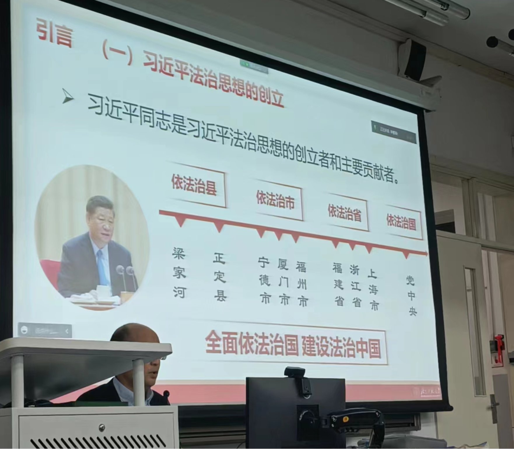 此次讲座中,梁迎修老师在引言部分向大家讲述了习近平法治思想的创建历程及其重大意义。习近平同志是习近平法治思想的创立者和主要贡献者,习近平法治思想是当代中国马克思主义法治理论,21世纪马克思主义法治理论。习近平法治思想以一系列具有原创性、时代性的新理念新思想新战略,在中国特色社会主义法治理论和实践上实现了重大突破、重大创新、重大发展,以具有解释力、穿透力的新视野新思维新方法,深化了对共产党依法执政规律、社会主义法治建设规律、人类社会法治发展规律的认识,充分彰显了科学理论的强大创新力、生命力、战斗力。
