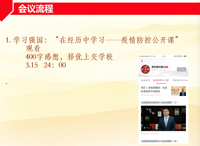 2020年3月7日晚上18:30,欧洲杯 本科生党支部于“腾讯会议”平台召开了组织生活会。这是春季学期第一次组织生活会,也是欧洲杯 本科生党支部第一次“云”会议。本次组织生活会由支部书记苏茹昕主持。首先同志们起立齐唱国际歌。 “在这一特别而又特殊的时期,大家过得还好吗?”一声暖心的问候,开启了本次会议的主题——疫情期间党支部的工作及成员们的抗疫经历分享。 首先,苏茹昕书记下发了几点通知。第一是号召大家在学习强国平台观看疫情防控公开课,写下自己的感想积极投稿;其次,党员需要学习学生骨干学习材料,并在学习之后自己出一道考题、写一份感想或笔记,以加深理解。另外,符合条件并且有意愿继续入党的积极分子需着手开始准备发展大会的材料。最后,微党课大赛即将召开,在疫情期间有所思考感悟的成员都可以参与。 接下来,由周楚皓同志主持抗疫事迹分享环节。 陈楚怡同志分享了自己由一次偶然忘记带门卡而开启的志愿工作。她当时出于无奈旁观小区门口的社区工作人员实施检查工作,没想到这引发她进行了自我反思——我能否在这次抗疫中做更多贡献,而不只是宅在家里呢?于是,她通过父亲的工作渠道主动联系寻找需要心理援助的地方,然后通过京师心理大学堂等平台以及咨询师兄师姐,搜集心理建设的知识,撰写成文稿给公众号等媒体使用。陈楚怡同志认为这是一个很好的传递精神力量想机会,也是心理学人成长的机会。分享结束后,她还号召其他成员参与后续的情绪调控线下讲座活动。 下一位是苏茹昕同志进行分享。她浏览泉州市公众号招募志愿者的信息并报了名,被成功录用为志愿者,并参与了一系列支持工作。她还代表所有参与过线上抗疫的同学分享了工作过程。线上抗疫的第一部分是线上咨询,通过建立微信群,给面临挑战的人们提供陪伴和情感支持。接到的来访者有宅家的大学生、担心自己患病的人、寻求育儿经验的家长、想要控制自己成瘾行为的人等方方面面。很多问题她不知道该怎么回答,有时也不知道自己的回应是否帮到了对方,但她实事求是,明白自己能力的范围,在一开始就向对方坦诚自己大学生的身份,并尽力做到用心倾听。她学习到的经验是,无需过于在意自己志愿工作的不完美,有行动是最重要的。 线上抗疫的第二部分是科普文撰写。于心怡同学独立写了一篇科普,也审了其他同学为疫情写的文章,她感觉这些工作让她在无聊里找到了一个着力点,可以运用专业相关的知识技能为抗疫心理防线建设提供一点点支持。在写文章的过程中,她既学到了新的知识,也缓解了被“困”在家的无力感和焦虑感。 线上抗疫的第三部分是开心说吧工作,心理辅导员们鼓励师大附小的小朋友们行动起来,为抗疫一线的奋斗者们送去鼓励,表达自己的感谢。孩子们的图画、刺绣、积木等作品让大家深受感染。 接下来是线下抗疫分享环节。蒋祎诺同学参与了社区卡口来往人员登记和社区内巡逻工作。整体上,人们都很配合工作,不过一次劝说不愿登记的居民的工作让她印象深刻。她从社区工作者那里学到,基层工作重要的是耐心和共情,基层工作者非常辛苦,值得我们学习。魏铱楠同学向社区书记毛遂自荐,参与到了每晚社区卡口执勤工作,最初的几天恰逢大雪,手脚都冻的冰凉。她感到社区工作非常紧张,来往人员和车辆非常频繁,每天登陆的车牌号能达到150。在执勤期间,她认识了一位从大年初二开始就坚持在防疫第一线的叔叔,还见到了一位在风雪中等待住户取餐等了20分钟的外卖小哥,她深感钦佩。她还分享了自己对于是否通融不守规则的居民的思考,提出对如何让工作严谨而不死板的反思。 最后开启讨论环节。周楚皓同志分享了自己如何帮助志愿者协调与不配合工作的群众的矛盾。陆靖仪同学分享了自己在武汉的真实经历。梁静同学分享了自己见证的社区工作——挨家挨户上门调查居民春节前出行情况,为需要关注的居民提供寻求支持的信息。苏茹昕同志讲述了自己在公交车劝导工作中见到的一位给中央写信的老爷爷,感悟到建立向国家建言献策意识的必要性。周靖怡同学分享了自己对于本次疫情中对国家科技进步、行政工作效率提高的观察。 周楚皓同志在最后号召大家继续撰写抗疫期间的心得并向支部投稿。本次生活会顺利结束! (本科生党支部 祁新越 供稿供图) |