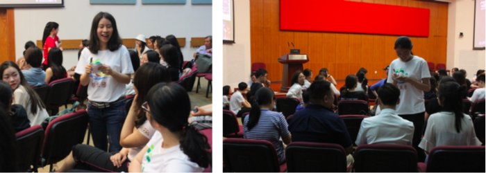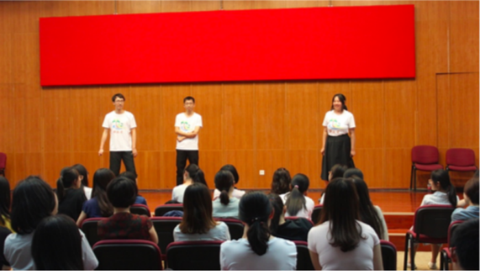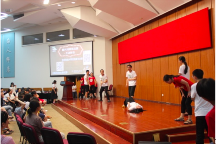 2018年5月27日晚上,在北师大英东学术会堂,北师大欧洲杯 即兴戏剧椰丝团成员联合即兴派部分成员开展了一场别开生面的即兴戏剧演出暨互动体验活动。这是椰丝团成员经历为期十周的培训后第一次大型演出实践,邀请到近百名观众来到现场了解即兴、近距离体验即兴的魅力。 即兴戏剧椰丝团隶属于欧洲杯 ,接受有多年青少年即兴教育资历的即兴派诗曼老师为期两个多月的专业团训,目前已带领过团队建设、数次工作坊以及525开幕式外场活动,期间还进行了情绪街拍的项目。作为北师大首个即兴戏剧团,这次活动还吸引和邀请到了中国传媒大学、北京邮电大学的同仁爱好者、杜威国际学校的校方董事等外校友人们欢聚一堂、切磋交流。 活动分2个环节:演出观看与互动(60分钟);现场体验活动(60分钟)包括暖场游戏、即兴短剧的学习与即兴联合演出的展示。活动的最开始,两位主持人与观众进行互动热身。首先是一个小小的暖场活动,让每个人一边倒数5,4,3,2,1,一边摇晃自己的手脚,身体,再不断地减小数字,最后越来越快,越来越快……大家在舞动着自己的身体。看,他们动得多么疯狂! 动完了身体还动起了声音:“哈哈”“椰丝团”“我爱你!”三个充满活力和热情的声音在观众席中分三块区域响起。当大家的身体和声音都热了起来后,主持人介绍了即兴是: - 没有剧本的 - 是通过现场和观众的互动,即兴创做的演出 - 没有彩排的 以及让观众赋予台上演员们一个关系,示范了演员如何与观众进行互动联结,调动起了观众们的积极与热情。 也就是说,即兴戏剧演员需要机敏地对应对当下的突发情况,并及时做出反应。这十分考验演员们的默契程度啊,包括他们现场沟通、倾听反馈、信息传递的意识和能力! 来看一下椰丝团和即兴派的演员们都有哪些! 在演出观看的环节中,椰丝团和即兴派的成员们为了自己能上台演出,均争先恐后地拥向主持人,进行了六场精彩的表演,让我们来具体看一看每个节目的细节吧! (1)拍拍走: 节目主持人亦是第一位演员,与另一位演员开始随意做动作,在一名观众喊停后开始了他们的对话与表演,随后两边的某演员在任一时刻拍手喊停定格住他们的动作,拍走其中一个人并模仿她定格的动作,重新定义并开始一段新的关系和对话,每一次的拍手都在切换关系和角色,既出乎意料又在情理之中,引得未出场的演员们和观众笑声不断。 (2)三头专家: 节目主持人请来了一个由三名演员共同饰演的“啊霍金”专家,特长是拆散情侣。三位演员互相猜测对方的想法,配合默契,每个人只说一个字,形成一句完整的话。专家拆散情侣的秘诀竟然是……“有就亲“!?在他们的深情演绎下,重现了学五楼下如何拆散一对情侣的场面,动作一致仿佛一个人,逗得大家哄堂大笑。一人说一个字连成完整的一句话回答问题,其回答匪夷所思,又能自圆其说,令台下观众大笑不已。 (3)空间转换: 五名演员以夸大的动作、动作凝固后的转换时空为衔接,让观众随着演员在不同的时空里切换,看似意想不到却又在意料之中,看似脑洞大开却又合情合理,同样引得场下欢乐不断。 (4)未来语专家: 这次主持人邀请到了一位来自未来星球的专家,还自带了一名翻译,专家的语言和动作都需要通过翻译传达给我们,夸张的动作,巧妙的解释,为现场的观众答疑解惑。 (5)案发现场: 地上突然出现了一具“尸体”! 凶手的身份(僵尸)、事发地点(游乐场)和凶器(棉花糖)都是观众们抛来的奇思妙想。4个演员一个接一个地出现,通过表演的形式,一个演一个猜,揭露“真相”,在这过程中,演员们的交流都是通过夸张的动作和“胡言乱语”,看似猜中又似偏离,场上一阵阵捧腹大笑。 (6)观众纸条: 一名主持人带着两名助手到场下向观众们要“台词”,有歌词、电视剧台词、平时日常生活中做的动作、随意说的话……这些都不能被演员们知道。接着由观众赋予台上两名演员一个关系。他们在表演的过程中,随机从地上抽取带有台词或者动作的纸条,嫁接到当前说的对话和动作中,巧妙的嫁接和意外之中的情理又引起一阵阵欢乐。 看完了六场精彩的即兴演出后,观众们都被即兴表演中呈现的前后反转和夸张的肢体表现所吸引,这可能就是即兴的魅力所在。 看,观众们已经跃跃欲试,迫不及待地要进入第二个现场体验活动的环节。随后,演员们将观众分组,由演员带领大家开始进行热身和即兴表演的练习体验。 随着一声声的“停”,大家穿越在不同的场景,演绎着自己的角色:医生,刚分手的情侣,老人……而剧情之间的衔接就是相同的动作:被放大的动作,出乎意料的剧情切换——上一秒两个人含情脉脉,下一秒变成母子吵架。在即兴的演出中,大家打破了固有思维的束缚,尽情发挥,释放自我,串联起一个个“脑洞大开”的场景,人物关系、剧情发展和夸张的肢体表演惹人频频捧腹大笑。即兴表演的拍拍走精髓在于对动作和新角色的灵感以及另一个成员的接受和配合这个“新设定”,我们可以放下评价,放下好与坏,认真去感受这个动作,去倾听动作的声音,再创造一个属于自己的新的场景,就是这么即兴! 之后是集体登台表演,每个人都可以喊“停!”来进入到上一个人定格的动作,根据用自己的想法演绎新的角色,用自己的方式与他人共同演绎一出精彩的表演!在这里,时间,空间都没有了限制,只要尽情发挥想象力你就