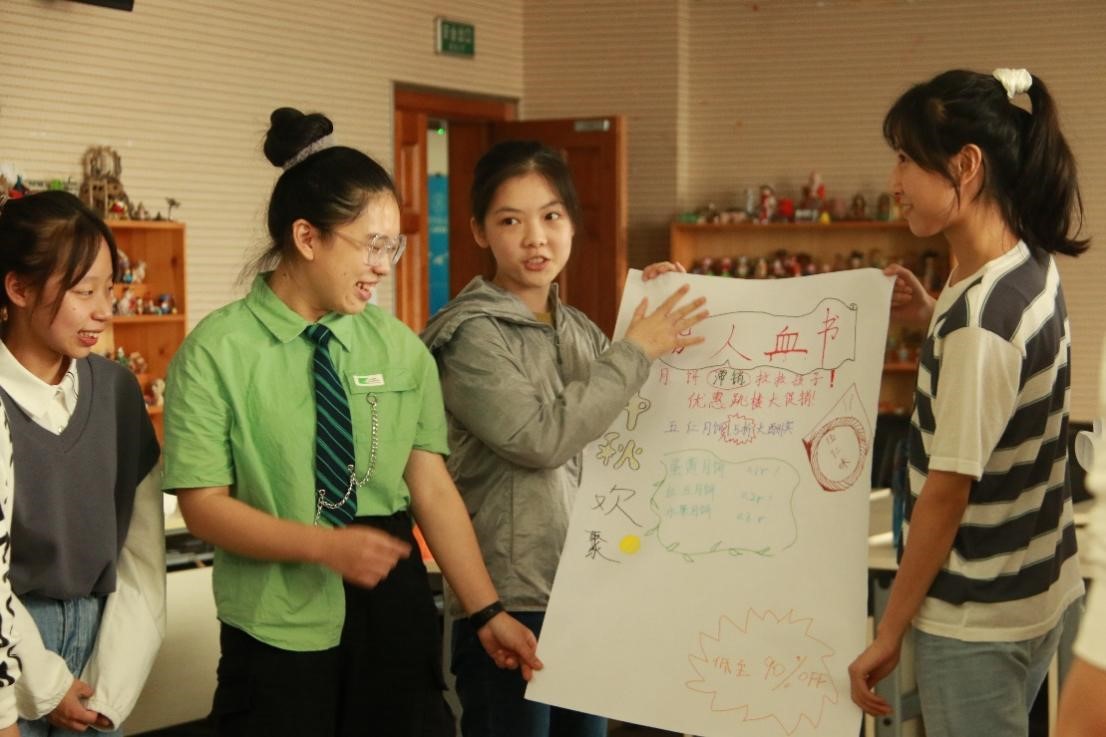 图 同学们分组展示海报设计 最后,同学们依次用一个词表达了这次团辅的感受,有“欣喜”,有“满足”,有“惊喜连连”,也有“感悟颇多”……活动正式结束后,有许多同学表示:“和大家的关系拉近了”、“找到了志同道合的朋友”,也有同学提出了对自己的期许:“要再勇敢一点”,还有一些善于思考的同学感悟道:“人际交往的过程也是认识自我、发现自我的过程”…… 通过这次活动,同学们更加熟悉了彼此,大家不止于点头之交,也有了心灵的沟通。希望同学们在未来的生活中,都能互帮互助,团结友爱,共度美好的大学生活!