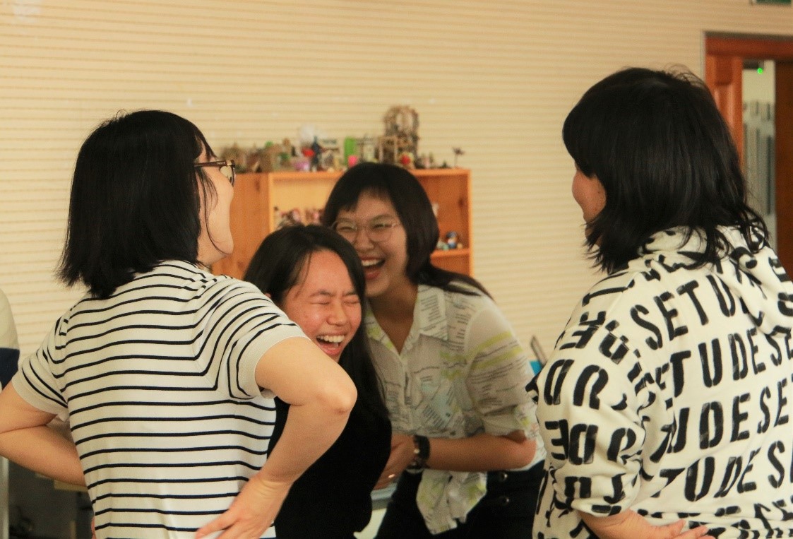 图 黄老师与同学们亲切交流 随后,黄老师又组织同学们进行了一个名为“幸福大转盘”的游戏。在一轮轮相遇与对话中,同学们既收获了“转角遇见你”的新鲜感,又有“重逢”后的惊喜。游戏中,同学们热情高涨,牵手拥抱拉近距离,男生间的”公主抱”更是引发频频欢呼。每一次“转动”,同学们都是兴致勃勃的来,依依不舍的离开。
