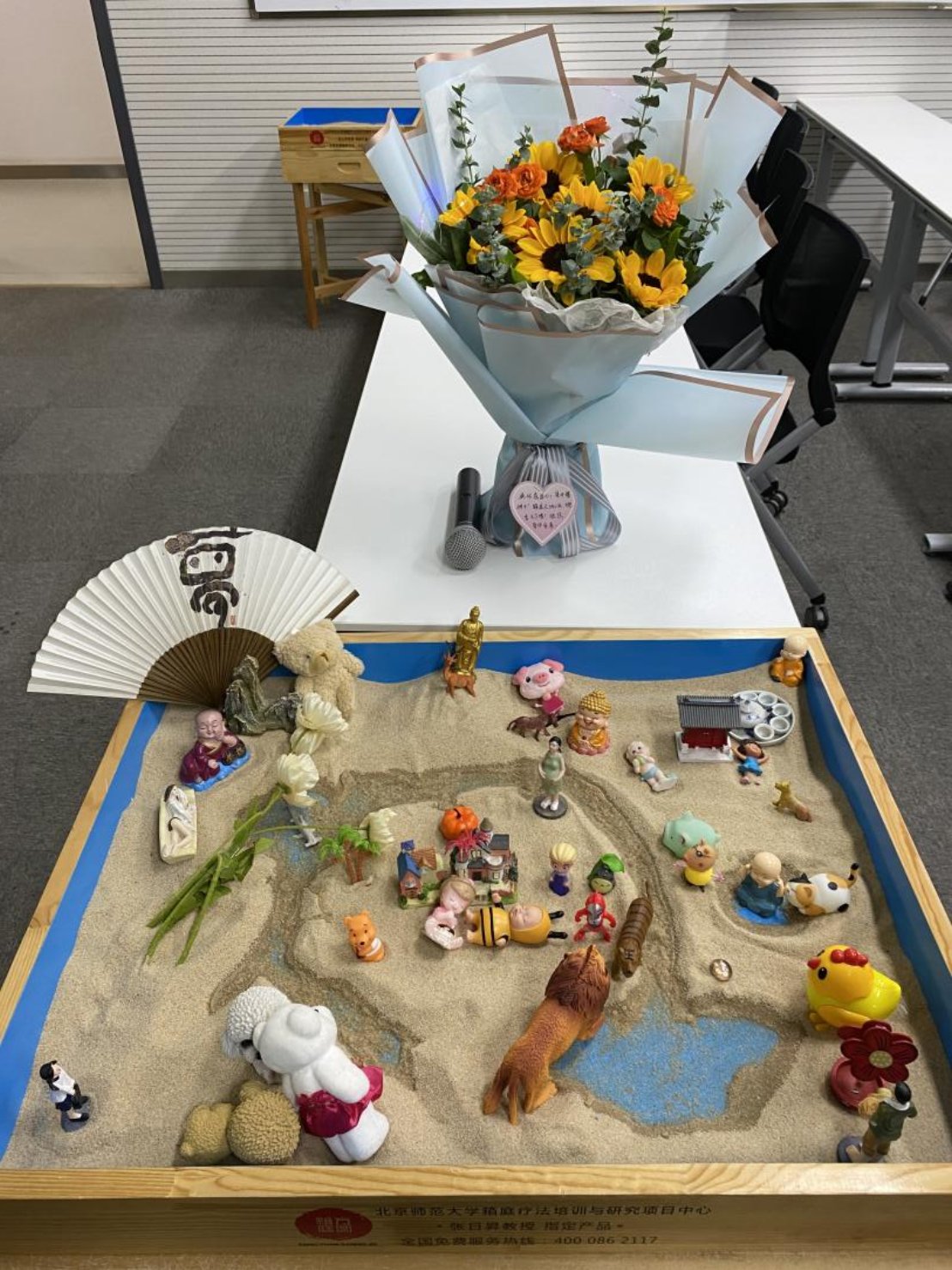 三天的课程内容饱满,体验充实,参课老师们表达了在本次课程中有收获、有触动、有成长。临近结束时,张老师与全体参课老师共同完成了一个团体箱庭作品,大家依次将自己选定好的玩具放入沙箱,构成了我们的箱庭世界,一期一会!