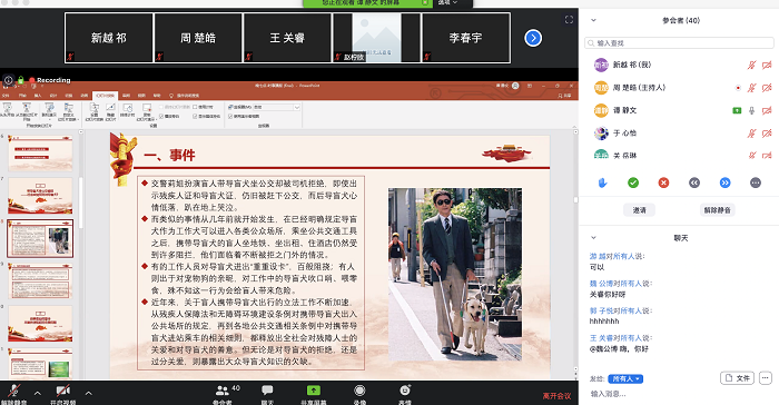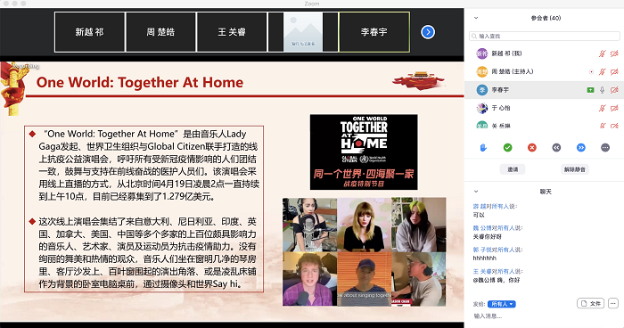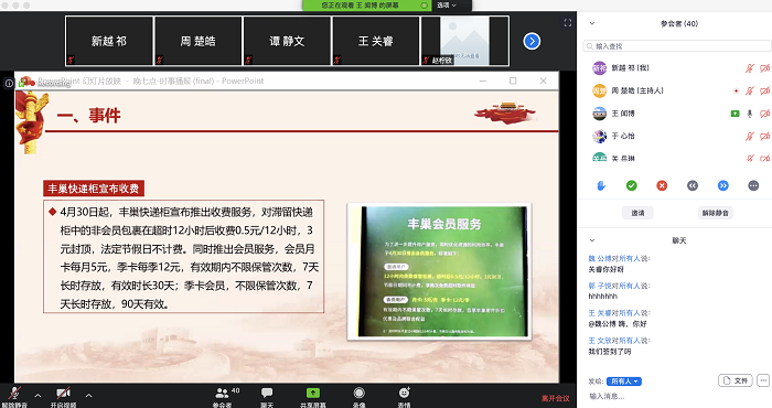 2020年5月16日晚七点,欧洲杯 本科生党支部在zoom线上会议平台召开时事分享会。本次分享会由周楚皓同学主持。大家相互问候,并合唱国际歌。 接下来便是第一组同学的时事播报。首先,赵柠欣同学以疫情引发的就业难题为背景,为大家介绍心理学人可能面临的前景,并向大家推荐阅读“心理学的17135种可能”,为自己的未来寻找更多机会,做更充分的准备。 接下来,由王关睿同学为大家带来中国对世界其他各国新冠肺炎疫情提供援助的情况。 王关睿同学还为大家带来了习近平主席深入农民家中走访他们生活状况的故事和图片。习近平主席亲切的话语和与百姓亲密无间的接触,让我们觉得,拥有这样一位亲民的主席,真好! 李春宇同学对刚才习近平主席深入农村考察百姓生活的新闻深有感触,因为他小时候也住过农村的炕,因此想起主席也坐在百姓炕头的情形,感觉分外亲切。 下一组的时事播报从李春宇同学开始。他播报的是美国举办的“one world together at home”公益演出在中国无法直播,直到直播结束5小时之后审核通过才在国内上线这一事件。在网络上,人们对这一事件的原因众说纷纭,李春宇同学为大家梳理了几种影响力比较大的观点,并谈了自己对于每种观点可靠性的分析。 接下来,由谭静文同学从导盲犬和其主人被公交车拒载后,狗狗趴在地上伤心哭泣的事件中,带领大家走进导盲犬和残障人士的生活。她表示,社会对于导盲犬存在许多误解,有时是过分的恐惧,有时是不恰当的关爱,这些都会干扰导盲犬的工作,给它和主人带来危险。 她向大家普及了导盲犬的相关知识,并为公众如何善待、理解和支持导盲犬的工作提出了一些倡议。 接下来,由王闻博同学播报近日被国内舆论所热议的丰巢快递柜对超时存储的顾客收费的事件。王闻博同学为大家梳理了事件各方所执观点,引起大家对消费者权益维护的思考。 下一位是陈泓宇同学,她带来的新闻是人们对五四青年节在B站推出的反响热烈的“后浪”演讲的讨论。 这次激烈的讨论中,她认为我们无需比出对错,因为讨论本身即是一种进步的体现。“君子美美与共,和而不同。”现在的年轻人越来越敢于表达自己的观点,这是非常宝贵的品质。通过这次辩论,我们也能看到年轻人难以掩饰的光亮。此外,我们也认识到了青年的多元化,我们需要不一样的声音来构筑这个灿烂的时代。 最后,魏公博同学报道的是国际护士节带给他的触动。他讲到,之前他并不知道有国际护士节。但由于母亲是医务工作者,因此他从小就对医务工作感兴趣,同时也震惊于自己不知道这一节日的存在。这引起了他的思考——我们每天都通过各种媒体看新闻,但这些平台会不断推送客户想看的东西,久而久之我们的视野就逐渐变得不那么宽阔了。我们也渐渐地对其他事情不感兴趣,渐渐地懒于思考。因此,这警醒着我们,应多去看看我们不知道但非常有意义的信息。 至此,全部的新闻展示完毕。周楚皓同学表示,今天所有同学报道的新闻都非常有深意,而且超越了播报新闻本身,体现了每位同学认真的思考。 李可心同学表示,今天播报的新闻自己之前也有过了解,因此感触很深。对于导盲犬的那则新闻,她分享了自己的观察:英国公交车的底部距离地面非常近,没有中国公交车这样的台阶,这是对残障人士的极大便利,这启示我们,改善弱势群体的生活需要考虑方方面面的细节。关于丰巢快递柜事件,她认为丰巢收费也是可以理解的,我们要谨慎提防成为资本操纵舆论的牺牲品,并支持为民带来便利的企业的良好发展。 周楚皓同学总结道,在今天的活动中,大家对新闻的解读和引申很好地发挥了新闻的思考性和争议性,这种氛围非常有助于大家思想的进步。 今天的时事分享会圆满收官! (本科生党支部祁新越 供图 供稿) |