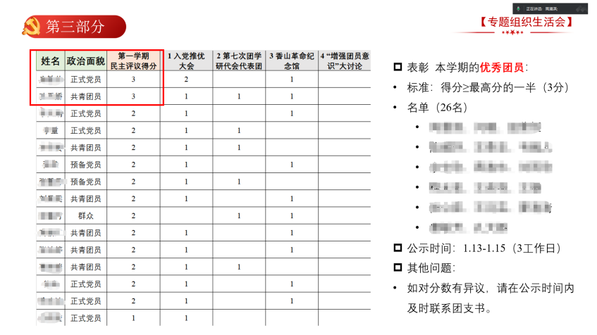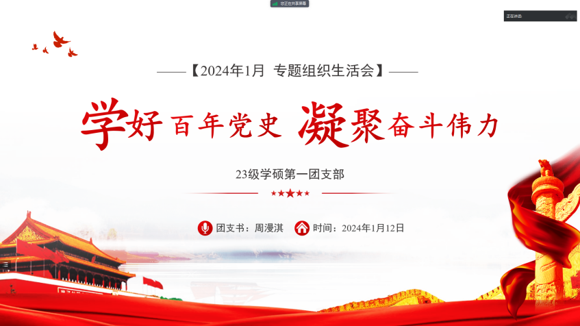 2024年1月12日,2023级学硕第一团支部线上成功举办主题组织生活会。首先组织团员认真学习重温习近平总书记在庆祝中国共产主义青年团成立一百周年大会上的讲话,然后总结梳理了团支部在团员和青年主题教育中的学习情况,接着结合“增强团员意识”大讨论的成果进行了深入讨论和评估,最后对团员先进性评价进行民主测评投票,评选学期优秀团员。