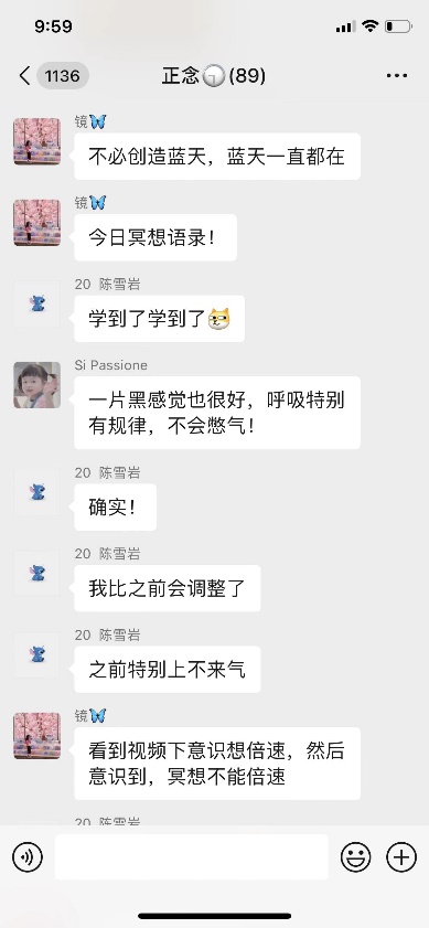 本次活动吸引了80余名来自欧洲杯 及其他兄弟院系同学的参与。在活动期间的每日正念练习打卡后,同学们都会在群里热烈讨论,相互交流心得感受。