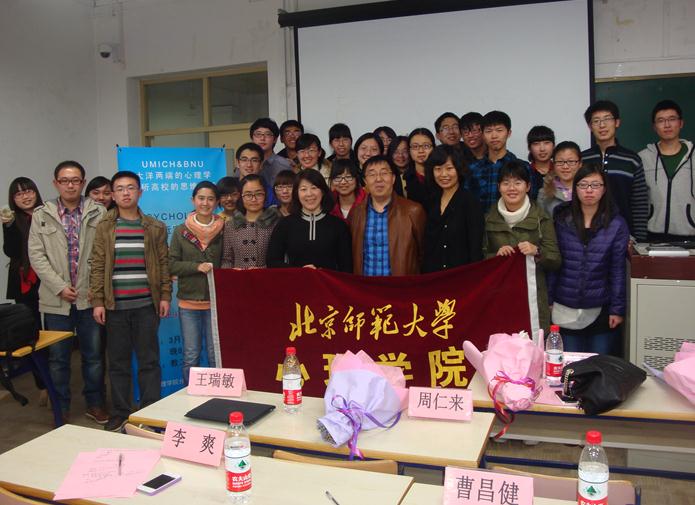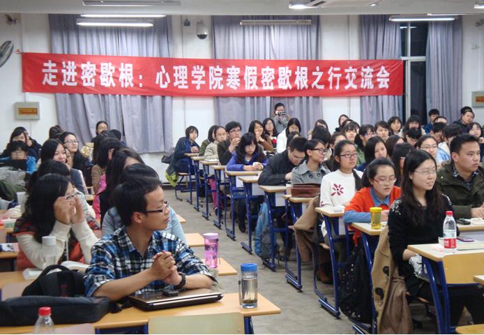 2013年3月13日晚八点,北京师范大学心理学院“走进密歇根:心理学院寒假密歇根之行交流会”在教二201教室举办。2013年1月19日至2月1日,心理学院副院长周仁来老师、分党委书记乔志宏老师及17名本科生组成的代表团前往密歇根大学进行学术交流。在为期两周的时间里,双方教授开展了卓有成效的会谈。参与交流的17名本科生,旁听了密歇根大学心理学系的本科生课程和心理学及其他学科的学术报告会,参与了许多富有特色的学生活动。通过与当地同学的交流全面地了解美国大学的教学、生活情况及中美文化的差异。 心理学院学生会从学生们实际需求出发,邀请代表团的老师、同学为更多学生分享大洋两端的学术进展与不同的校园氛围。此次交流会得到了学校、学院领导的大力支持。心理学院副院长周仁来教授,作为密歇根之行的带队老师之一,对整个活动的策划、进展给予密切关注。心理学院院长许燕教授,国际交流与合作处副处长刘冷馨老师,以及从美国回来的校友韩英全程参与了此次的交流会,与同学们进行了面对面的交流。 许燕院长首先明确了“密歇根之行”对于心理学院具有里程碑意义,向同学们介绍了学院未来对于国际交流方面工作的设想,以及对同学们未来发展的希望与期盼。希望同学们走出去培养自身的国际化视野,然后再回到我们学校、学院为我们的发展做出自己的努力。国际交流与合作处的刘冷馨老师介绍了从自己的角度出发未来国际交流处能为同学们出国交流提供哪些更好的项目,表达了学校对于学生国际交流活动的重视与支持,也热情欢迎学生找她交流沟通。周仁来教授作为最后发言的老师,一方面为大家说明了此次交流会的意义;另一方面也跟同学们分享了“密歇根之行”的总体感受与情况。周仁来教授风趣幽默的表述,让同学们对接下来进行的学生交流环节充满了期待。 前往密歇根交流的三位学生代表朱浩然、黄煜舒、万嘉昕分别从交流活动的行程、从中美课堂不同看中美教育对比以及从自身感受出发谈美国校园文化与社会文化三个方面与同学们进行了分享。嘉宾韩英老师讲述了她20多年的海外经历及自己对于国外生活的体会,对“密歇根之行”同学们的所思所感表示了赞同,也提出了自己长时间在国外生活看到的更多的东西。 提问环节中,在了解同学们的困惑的同时,对于学生们提出的问题许燕院长悉心解答,并提出了自己的希望,希望同学们能够找到学习的内在动机,找到对学习的热情、对生活的热情。同学们都表示,这样与老师面对面的交流、诚挚地沟通的机会特别可贵,在此过程中增强了与老师的情感交流,也同时增进了师生之间的相互理解。至此,密歇根之行交流会圆满结束了,但心理学院为给同学们提供更好的国际交流项目所做的努力还在继续!