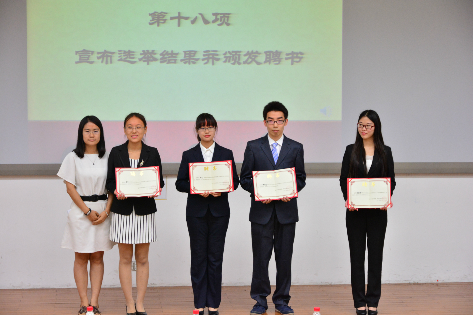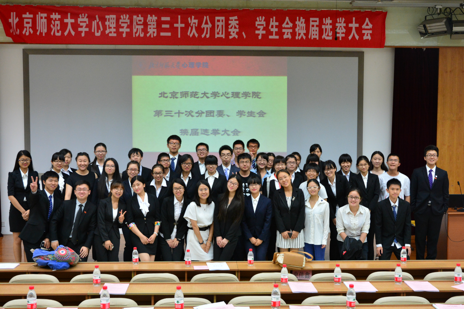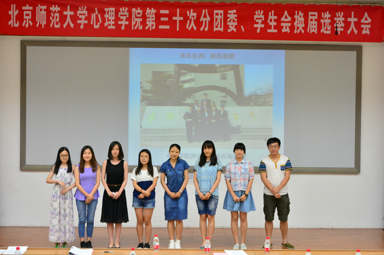 2015年6月13日,心理学院第三十次分团委、学生会换届选举大会在教九502隆重召开。校团委副书记于小雷老师,地理学与遥感科学学院分团委书记倪佳琪老师,信息科学与技术学院分团委书记奚琦老师,校学生会主席宋来同学以及各院系学生代表受邀出席大会,我院分党委书记乔志宏老师,副书记王瑞敏老师,分团委书记史佳鑫老师以及全院200余名同学也参加了此次大会。大会由心理学院学生会副主席邓孟迪同学主持。 晚七时,大会开幕,全场起立,高唱《中华人民共和国国歌》。首先,校团委副书记于小雷老师致辞。他在致辞中充分肯定了心理学院分团委、学生会一年以来的工作,并向大会的召开表示热烈的祝贺。随后,心理学院分党委书记乔志宏老师致辞。乔老师勉励同学们在发展专业的同时要积极拓宽自己的眼界,培养自己的人文素养,勇于承担社会赋予的责任,在服务同学、服务社会的过程中锻炼自己。另外,乔老师对学生会提出希望,希望心理学院学生会要以维护同学们的权益为使命,以用心理学的专业知识服务师生、服务社会为己任,继承传统、勇于创新,在学生工作中实现自己的价值。 接下来,宋来同学代表校学生会致辞,表达了对新一届团学工作领导班子的期许。 心理学院学生会副主席闫梦格同学代表筹委会向大会做了筹备情况报告。分团委副书记张文菊同学、学生会主席张笑然同学分别向大会报告了2014-2015学年分团委和学生会工作情况。 报告结束后,大会进入选举环节,分团委、学生会候选人依次进行竞选演讲并接受在场同学们的提问。随后,在总监票人张照鹏同学的主持下,在场全体同学进行了无记名投票。大会计票期间,李小红同学向大会做了学生提案报告。之后,心理学院优秀团体代表——辩论队以及棒垒球进行了团体风采展,与大家分享了这一年来的收获与感悟。 计票结束后,总监票人张照鹏同学宣读了计票结果,分团委书记史佳鑫老师宣布了选举结果,大会选举产生了北京师范大学心理学院第三十届分团委副书记甘琳琳,学生会主席团成员储成晋、代艺、李卉子。随后,史佳鑫老师对心理学院全体同学以及老一届学生干部表达了感谢,同时鼓励新一届的学生干部珍视大会赋予的权力,继续努力为学院同学服务。 最后,王瑞敏老师做了简短的发言,王老师在发言中充分肯定了第二十九届分团委、学生会在各项工作中取得的出色成绩,同时表达了对新一届学生领导班子的期许和要求。王老师指出,培养学生工作能力、锻炼管理能力提升综合素质对每个本科生都意义非凡,希望大家利用好心理学院的平台,积极进取,追求卓越。 在掌声中,本次换届选举大会圆满结束。新一轮的学生工作即将开始,我们相信,在新一届学生干部的努力下,心理学院的团学工作将会越来越好!