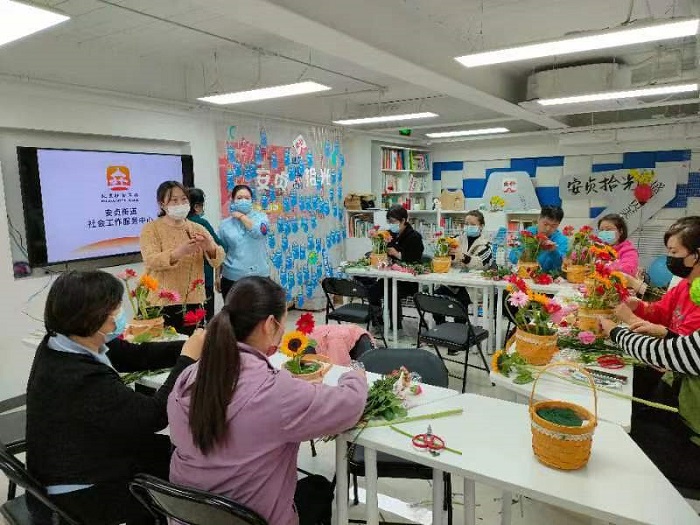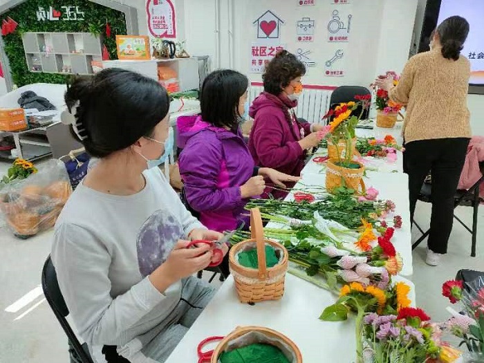 本次志愿服务的主要内容是辅助社区工作人员进行插花活动。社区各位参与者在工作人员的指导下了解插花相关知识,并尝试进行插花的练习,两位志愿者辅助工作人员的工作,并对本次活动进行拍照记录。