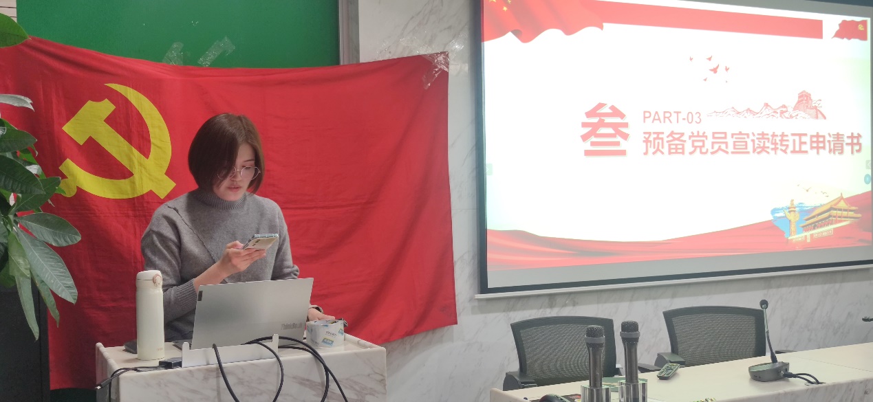 支部书记李紫菲介绍会议基本情况以及申请转正的预备党员夏月同志的基本情况,介绍人李紫菲宣读介绍意见。 接下来,由夏月同志宣读转正申请书。在一年预备期中,夏月同志在思想作风、党性修养、学业方面都取得了长足进步。夏月同志坚定理想信念,加强了对党组织的认识,增强了自己的思想觉悟,拥有为人民服务的远大理想;积极参与支部活动,政治修养有明显提升;认真学习科研前沿,积极参加学习和科研活动,提升专业技能,为服务人民打下了坚实的基础。