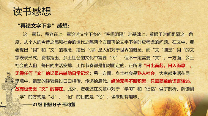 而后,邢昀萱同志从礼治与法治的角度,结合相关视频阐述了《乡土中国》的现实意义,并分享了组内同学的优秀读书感想。最后,胡可萱同志带领同志们进行了知识问答,张西然同志组织同志们阅读了《乡土中国》的经典语句。