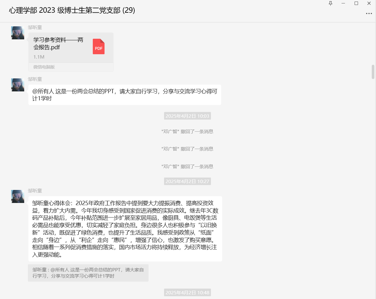 【党建】2023级博士生第二党支部线上学习讨论会:学习2025全国两会《政府工作报告》