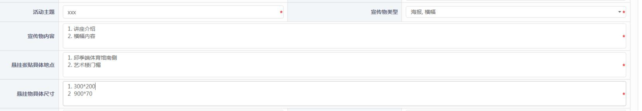 7.邮件提醒:请在提交系统申请后,请向欧洲杯党委副书记史老师发送【校园宣传物悬挂审批】的提醒邮件[email protected],史老师会完成【组织审核】环节,其余审批待相关部门陆续完成。邮件内容需要包含:什么群体、什么时间、什么活动、于什么时间提交了宣传物悬挂审批申请,烦请史老师审批,并在文末附上自己的姓名+所属的班级/学生组织部门+联系方式,便于有问题电话沟通。 三、审批流程 申请人填报后,首先由单位副职领导对宣传物的意识形态、文字、尺寸、颜色,悬挂时间地点等进行审核。后续审批流程依次为单位正职领导、总务长办公室(后勤管理处)、党委宣传部、党委/校长办公室、保卫处(部)。 任一节点对审批表提出修改意见并退回后,申请人须按照意见修改后重新提交申请。 所有审批流程结束后,申请人需要在宣传物张贴后上传实物照片以保证张贴的宣传物与审批系统上传的一致。 四、注意事项 1. 同一活动需悬挂张贴多个宣传物时,可多选宣传物类型,如“横幅,海报”。“宣传物内容” 与“悬挂张贴具体地点”需自行换行输入并标注序号,每个宣传物内容占一行。